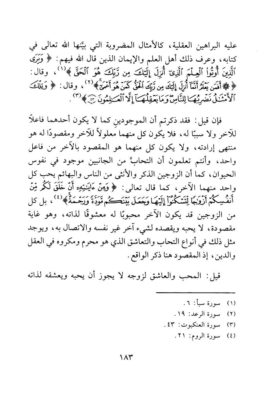 فإن قيل: فقد ذكرتم أن الموجودينِ كما لا يكون أحدهما فاعلاً للاَخر ولا سببا له، فلا يكون كل منهما معلولاً للآخر ومقصودًا له هو منتهى إرادته، ولا يكون كل منهما هو المقصود بالاَخر من فاعل واحد، وأنتم تعلمون أن التحابَّ من الجانبين موجود في نفوس الحيوان، كما أن الزوجين الذكر والأنثى من الناس والبهائم يحب كل واحد منهما الاخر، كما قال تعالى: (وَمِنْ آَيَاتِهِ أَنْ خَلَقَ لَكُمْ مِنْ أَنْفُسِكُمْ أَزْوَاجًا لِتَسْكُنُوا إِلَيْهَا وَجَعَلَ بَيْنَكُمْ مَوَدَّةً وَرَحْمَةً) (4)، بل كل من الزوجين قد يكون الآخر محبوبًا له معشوقًا لذاته، وهو غاية مقصودة، لا يحبه ويقصده لشيء آخر غير نفسه والاتصال به، ويوجد مثل ذلك في أنواع التحاب والتعاشق الذي هو محرم ومكروه في العقل والدين، إذ المقصود هنا ذكر الواقع.
