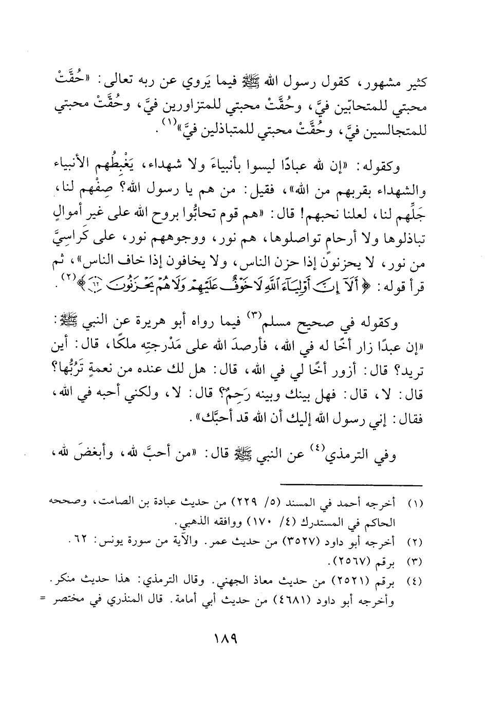 كثير مشهور، كقول رسول الله - صَلَّى اللَّهُ عَلَيْهِ وَسَلَّمَ - فيما يَروي عن ربه تعالى: "حُقَّتْ محبتي للمتحابّين فيَّ، وحُقَّتْ محبتي للمتزاورين فيَّ، وحُقَّتْ محبتي للمتجالسين فيَّ، وحُقَّتْ محبتي للمتباذلين فيَّ " (1).