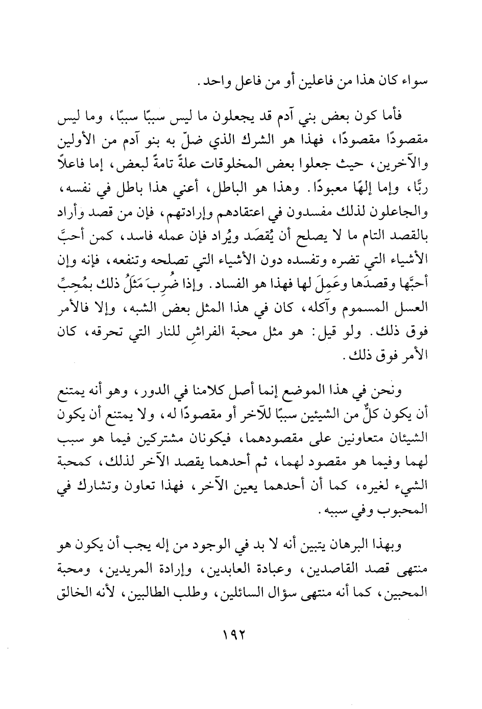 ونحن في هذا الموضع إنما أصل كلامنا في الدور، وهو أنه يمتنع أن يكون كلّ من الشيئين سببًا للَاخر أو مقصودًا له، ولا يمتنع أن يكون الشيئان متعاونين على مقصودهما، فيكونان مشتركين فيما هو سبب لهما وفيما هو مقصود لهما، ثم أحدهما يقصد الآخر لذلك، كمحبة الشيء لغيره، كما أن أحدهما يعين الآخر، فهذا تعاون وتشارك في المحبوب وفي سببه.
