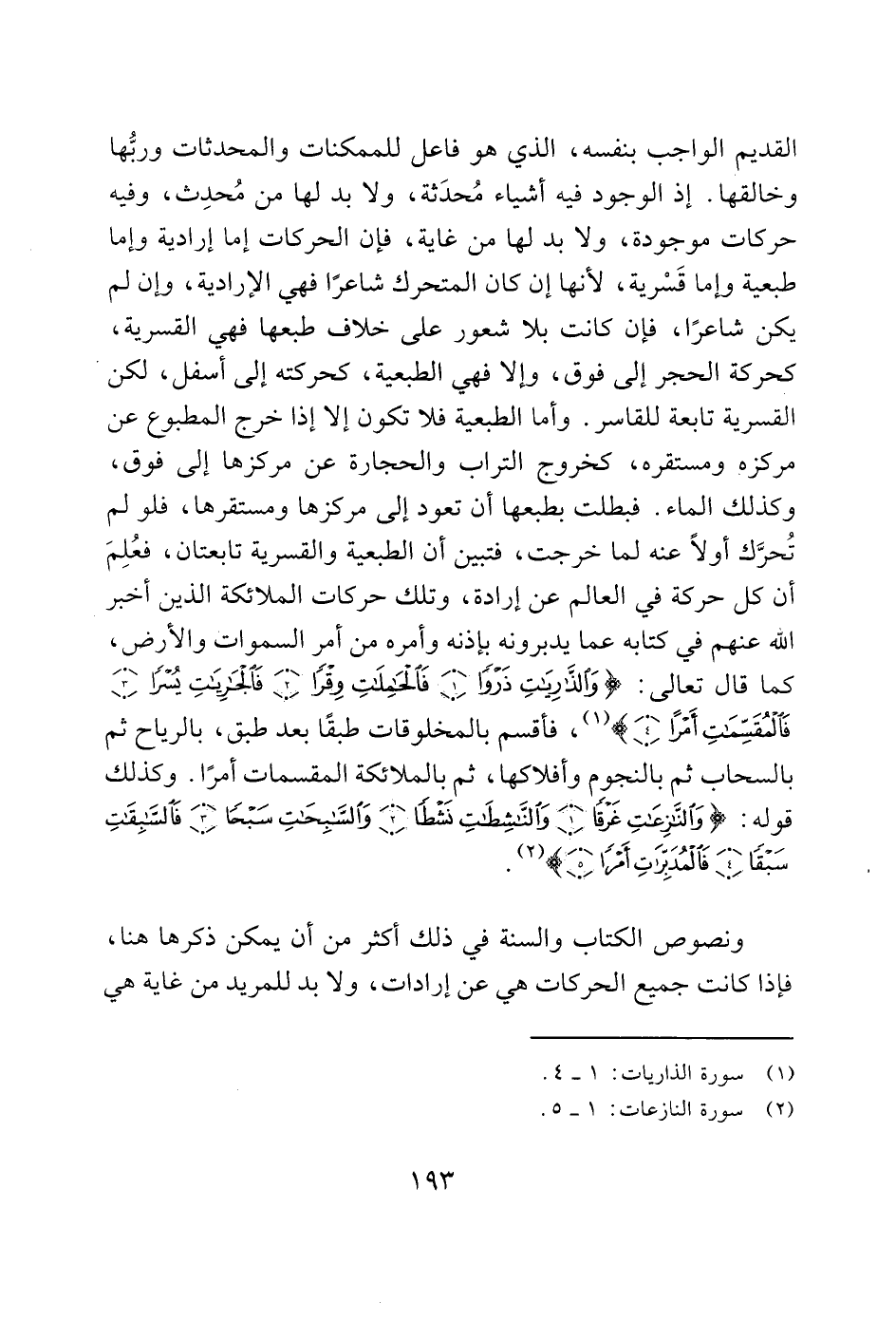 القديم الواجب بنفسه، الذي هو فاعل للممكنات والمحدثات وربُّها وخالقها. إذ الوجود فيه أشياء مُحدَثة، ولا بد لها من مُحدِث، وفيه حركات موجودة، ولا بد لها من غاية، فإن الحركات إما إرادية وإما طبعية وإما قَسْرية، لأنها إن كان المتحرك شاعرًا فهي الإرادية، وإن لم يكن شاعرًا، فإن كانت بلا شعور على خلاف طبعها فهي القسرية، كحركة الحجر إلى فوق، وإلا فهي الطبعية، كحركته إلى أسفل، لكن القسرية تابعة للقاسر. وأما الطبعية فلا تكون إلا إذا خرج المطبوع عن مركزه ومستقره، كخروج التراب والحجارة عن مركزها إلى فوق، وكذلك الماء. فبطلت بطبعها أن تعود إلى مركزها ومستقرها، فلو لم تُحرَّك أولاً عنه لما خرجت، فتبين أن الطبعية والقسرية تابعتان، فعُلِمَ أن كل حركة في العالم عن إرادة، وتلك حركات الملائكة الذين أخبر الله عنهم في كتابه عما يدبرونه بإذنه وأمره من أمر السموات والأرض، كما قال تعالى: (وَالذَّارِيَاتِ ذَرْوًا (1) فَالْحَامِلَاتِ وِقْرًا (2) فَالْجَارِيَاتِ يُسْرًا (3) فَالْمُقَسِّمَاتِ أَمْرًا (4)) (1)، فأقسم بالمخلوقات طبقًا بعد طبق، بالرياح ثم بالسحاب ثم بالنجوم وأفلاكها، ثم بالملائكة المقسمات أمرًا. وكذلك قوله: (وَالنَّازِعَاتِ غَرْقًا (1) وَالنَّاشِطَاتِ نَشْطًا (2) وَالسَّابِحَاتِ سَبْحًا (3) فَالسَّابِقَاتِ سَبْقًا (4) فَالْمُدَبِّرَاتِ أَمْرًا (5)) (2).
