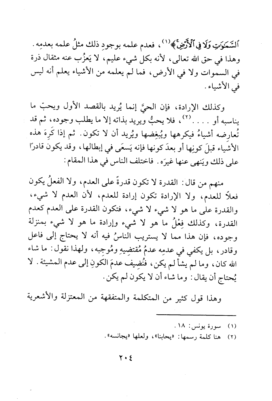 وكذلك الإرادة، فإن الحيَّ إنما يُريد بالقصد الأول ويحبّ ما يناسبه أو .... (2)، فلا يحبُّ ويريد بذاته إلا ما يطلب وجوده، ثم قد تُعارِضه أشياءُ فيكرهها ويُبغِضها ويُريد أن لا تكون. ثم إذا كَرِهَ هذه الأشياء قبلَ كونها أو بعدَ كونها فإنه يَسعَى في إبطالها، وقد يكون قادرًا على ذلك ويَنهى عنها غيرَه. فاختلف النالس في هذا المقام: