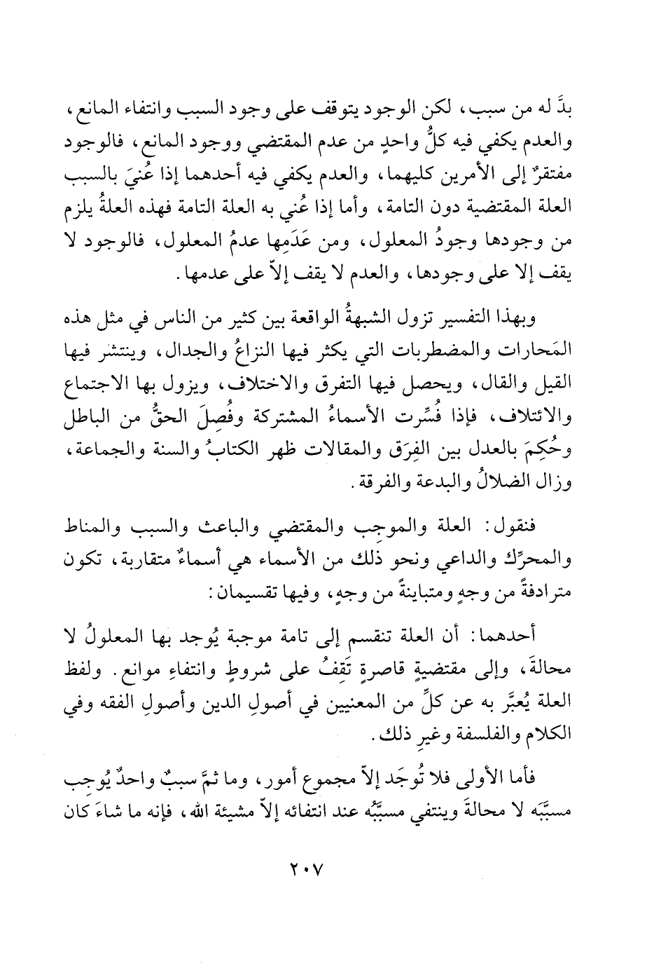 أحدهما: أن العلة تنقسم إلى تامة موجبة يُوجد بها المعلولُ لا محالةَ، وإلى مقتضيةٍ قاصرةٍ تَقِفُ على شروطٍ وانتفاءِ موانع. ولفظ العلة يُعبَّر به عن كلِّ من المعنيين في أصولِ الدين وأصولِ الفقه وفي الكلام والفلسفة وغيرِ ذلك.