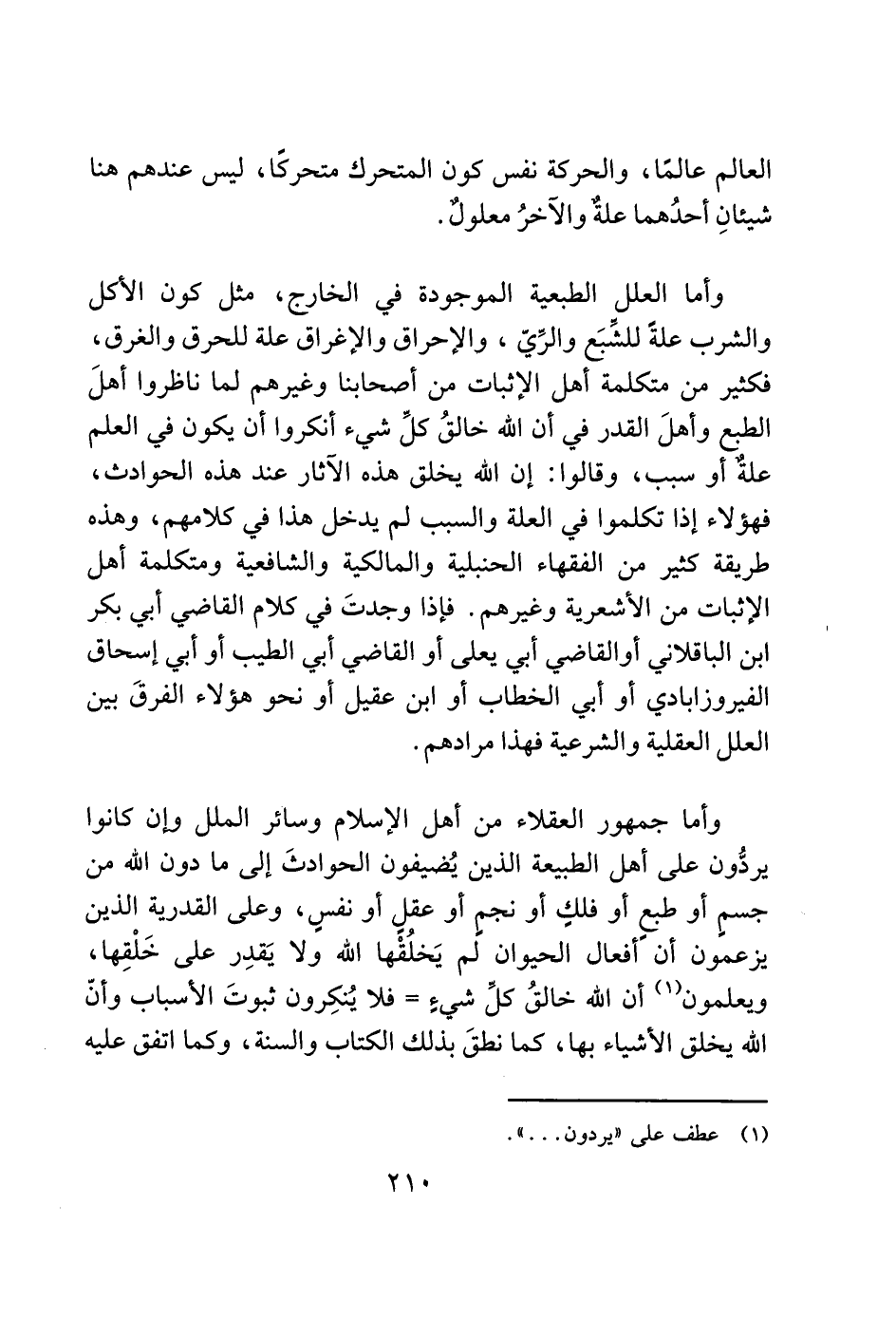 وأما العلل الطبعية الموجودة في الخارج، مثل كون الأكل والشرب علةً للشَبَع والريّ، والإحراق والإغراق علة للحرق والغرق، فكثير من متكلمة أهل الإثبات من أصحابنا وغيرهم لما ناظروا أهلَ الطبع وأهلَ القدر في أن الله خالقُ كلِّ شيء أنكروا أن يكون في العلم علةٌ أو سبب، وقالوا: إن الله يخلق هذه الآثار عند هذه الحوادث، فهؤلاء إذا تكلموا في العلة والسبب لم يدخل هذا في كلامهم، وهذه طريقة كثير من الفقهاء الحنبلية والمالكية والشافعية ومتكلمة أهل الإثبات من الأشعرية وغيرهم. فإذا وجدتَ في كلام القاضي أبي بكر ابن الباقلاني أوالقاضي أبي يعلى أو القاضي أبي الطيب أو أبي إسحاق الفيروزابادي أو أبي الخطاب أو ابن عقيل أو نحو هؤلاء الفرقَ بين العلل العقلية والشرعية فهذا مرادهم.