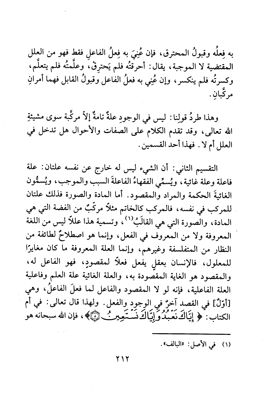 التقسيم الثاني: أن الشيء ليس له خارج عن نفسه علتان: علة فاعلة وعلة غائية، ويُسمّي الفقهاءُ الفاعلةَ السبب والموجب، ويُسمُّون الغائيةَ الحكمة والمراد والمقصود. أما المادة والصورة فذلك علتان للمركب في نفسه، فالمركب كالخاتم مثلاً مركّبٌ من الفضة التي هي المادة، والصورة التي هي القالَبُ (1)، وتسمية هذا عللاً ليس من اللغة المعروفة ولا من المعروف في الفعل، وإنما هو اصطلاحٌ لطائفة من النظار من المتفلسفة وغيرهم، وإنما العلة المعروفة ما كان مغايرًا للمعلول، فالإنسان بعقلٍ يفعل فعلاً لمقصودٍ، فهو الفاعل له، والمقصود هو الغاية المقصودة به، والعلة الغائية علة العلم وفاعلية العلة الفاعلية، فإنه لولا المقصود والفاعل لما فعلَ الفاعلُ، وهي [أوّلٌ] في القصد آخرٌ في الوجوِد والفعل. ولهذا قال تعالى: في أم الكتاب: (إِيَّاكَ نَعْبُدُ وَإِيَّاكَ نَسْتَعِينُ (5))، فإن الله سبحانه هو