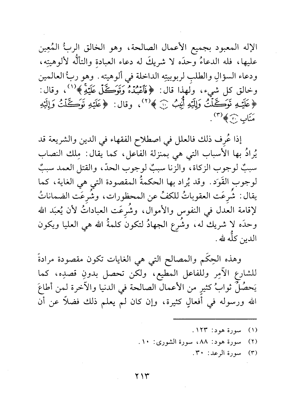 الإله المعبود بجميع الأعمال الصالحة، وهو الخالق الربُّ المُعِين عليها، فله الدعاءُ وحدَه لا شريكَ له دعاء العبادةِ والتألُه لألوهيتِه، ودعاء السؤالِ والطلب لربوبيتِه الداخلة في ألوهيته. وهو ربُّ العالمين وخالق كل شيء، وَلهذا قال: (فَاعْبُدْهُ وَتَوَكَّلْ عَلَيْهِ) (1)، وقال: (عَلَيْهِ تَوَكَّلْتُ وَإِلَيْهِ أُنِيبُ (10)) (2)، وقال: (عَلَيْهِ تَوَكَّلْتُ وَإِلَيْهِ مَتَابِ (30)) (3).