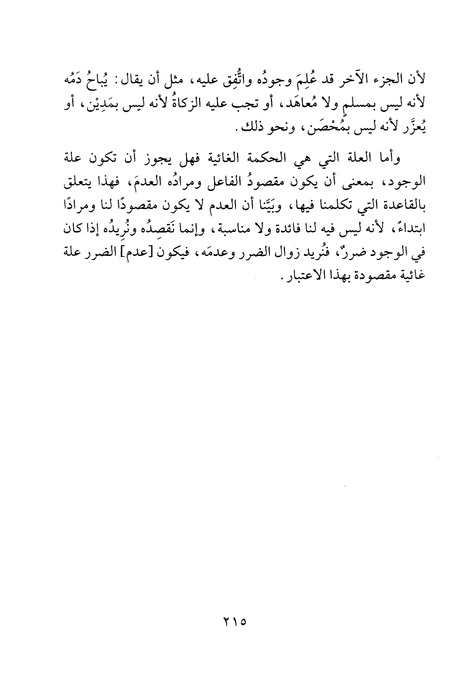 وأما العلة التي هي الحكمة الغائية فهل يجوز أن تكون علة الوجود، بمعنى أن يكون مقصودُ الفاعل ومرادُه العدمَ، فهذا يتعلق بالقاعدة التي تكلمنا فيها، وبَيَّنا أن العدم لا يكون مقصودًا لنا ومرادًا ابتداءً، لأنه ليس فيه لنا فائدة ولا مناسبة، وإنما نَقصِدُه ونُرِيدُه إذا كان في الوجود ضررٌ، فنُريد زوال الضرر وعدمَه، فيكون أعدم، الضرر علة غائية مقصودة بهذا الاعتبار.
