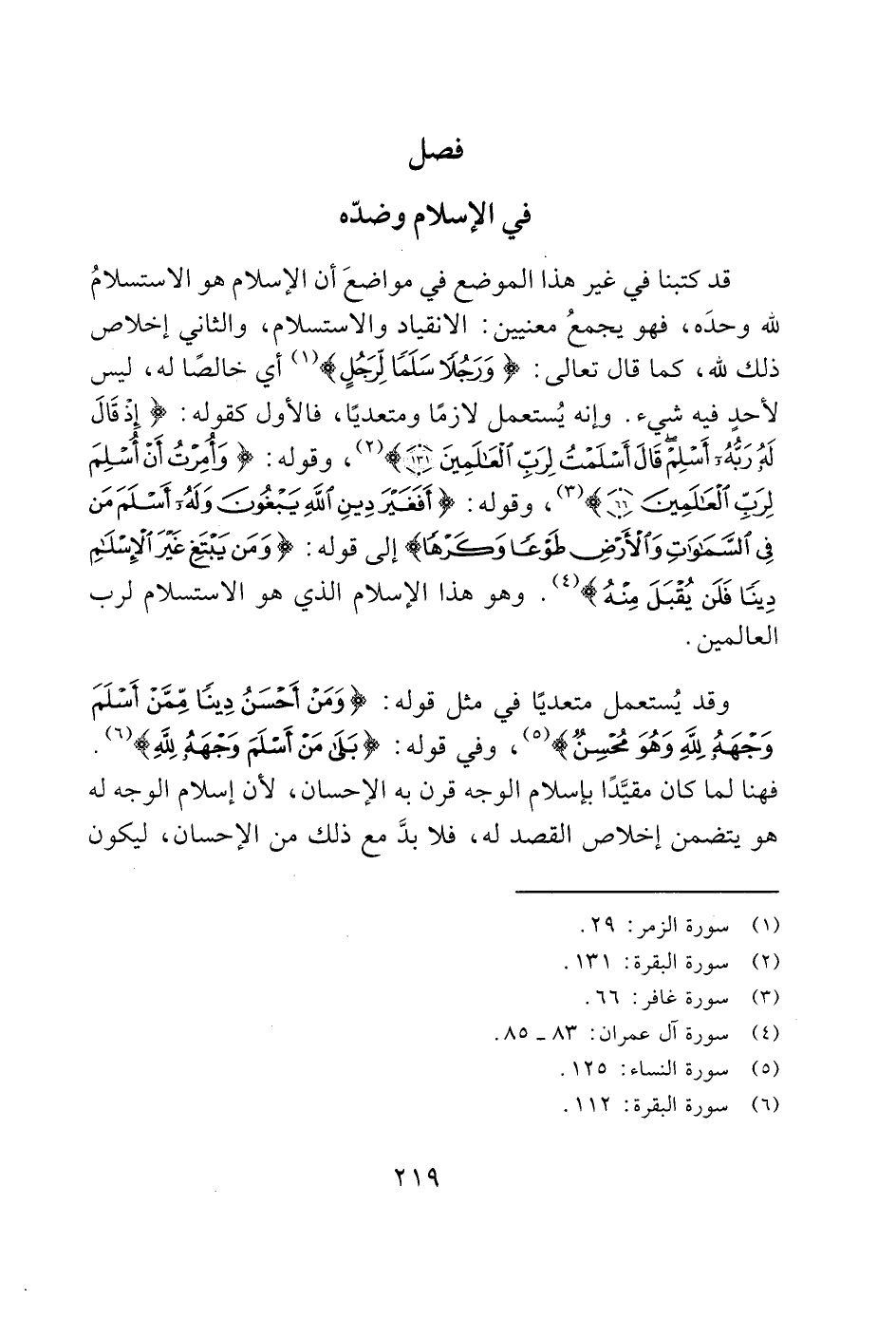 قد كتبنا في غير هذا الموضع في مواضعَ أن الإسلام هو الاستسلامُ لله وحدَه، فهو يجمعُ معنيين: الانقياد والاستسلام، والثاني إخلاص ذلك لله، كما قال تعالى: (وَرَجُلًا سَلَمًا لِرَجُلٍ) (1) أي خالصًا له، ليس لأحدٍ فيه شيء. وإنه يُستعمل لازمًا ومتعديًا، فالأول كقوله: (إِذْ قَالَ لَهُ رَبُّهُ أَسْلِمْ قَالَ أَسْلَمْتُ لِرَبِّ الْعَالَمِينَ (131)) (2)، وقوله: (وَأُمِرْتُ أَنْ أُسْلِمَ لِرَبِّ الْعَالَمِينَ (66)) (3)، وقوله: (أَفَغَيْرَ دِينِ اللَّهِ يَبْغُونَ وَلَهُ أَسْلَمَ مَنْ فِي السَّمَاوَاتِ وَالْأَرْضِ طَوْعًا وَكَرْهًا) إلى قوله: (وَمَنْ يَبْتَغِ غَيْرَ الْإِسْلَامِ دِينًا فَلَنْ يُقْبَلَ مِنْهُ) (4). وهو هذا الإسلام الذي هو الاستسلام لرب العالمين.