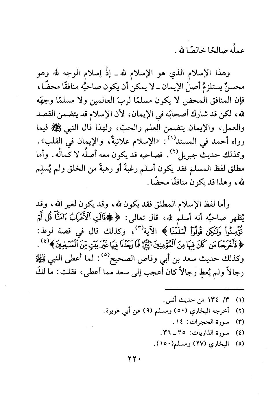 وأما لفظ الإسلام المطلق فقد يكون لله، وقد يكون لغير الله، وقد يُظهر صاحبُه أنه أسلم لله، قال تعالى: (قَالَتِ الْأَعْرَابُ آَمَنَّا قُلْ لَمْ تُؤْمِنُوا وَلَكِنْ قُولُوا أَسْلَمْنَا) الاَية (3)، وكذلك قال في قصة لوط: (فَأَخْرَجْنَا مَنْ كَانَ فِيهَا مِنَ الْمُؤْمِنِينَ (35) فَمَا وَجَدْنَا فِيهَا غَيْرَ بَيْتٍ مِنَ الْمُسْلِمِينَ) (4). وكذلك حديث سعد بن أبي وقاص الصحيح (5): لما أعطى النبي - صَلَّى اللَّهُ عَلَيْهِ وَسَلَّمَ - رجالاً ولم يُعطِ رجالاً كان أعجب إلى سعد مما أعطى، فقلت: ما لكَ