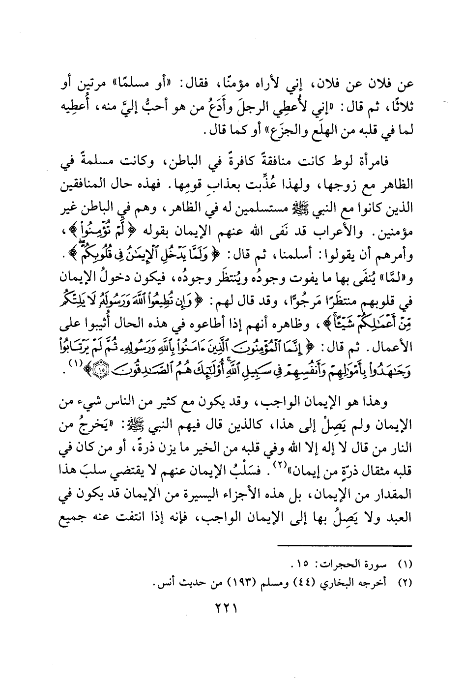 فامرأة لوط كانت منافقةَ كافرةً في الباطن، وكانت مسلمة في الظاهر مع زوجها، ولهذا عُذِّبت بعذاب قومِها. فهذه حال المنافقين الذين كانوا مع النبي - صَلَّى اللَّهُ عَلَيْهِ وَسَلَّمَ - مستسلمين له فيَ الظاهر، وهم في الباطن غير مؤمنين. والأعراب قد نَفى الله عنهم الإيمان بقوله (لَمْ تُؤْمِنُوا)، وأمرهم أن يقولوا: أسلمنا، ثم قال: (وَلَمَّا يَدْخُلِ الْإِيمَانُ فِي قُلُوبِكُمْ). و"لمَّا" يُنفَى بها ما يفوت وجودُه ويُنتظَر وجودُه، فيكون دخولُ الإيمان في قلوبهم منتظَرًا مَرجُوا، وقد قال لهم: (وَإِنْ تُطِيعُوا اللَّهَ وَرَسُولَهُ لَا يَلِتْكُمْ مِنْ أَعْمَالِكُمْ شَيْئًا) وظاهره أنهم إذا أطاعوه في هذه الحال أُثيبوا على الأعمال. ثم قال: (إِنَّمَا الْمُؤْمِنُونَ الَّذِينَ آَمَنُوا بِاللَّهِ وَرَسُولِهِ ثُمَّ لَمْ يَرْتَابُوا وَجَاهَدُوا بِأَمْوَالِهِمْ وَأَنْفُسِهِمْ فِي سَبِيلِ اللَّهِ أُولَئِكَ هُمُ الصَّادِقُونَ (15)) (1).