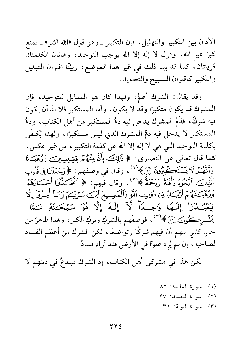 وقد يقال: الشرك أعمُّ، ولهذا كان هو المقابل للتوحيد، فإن المشرك قد يكون متكبرًا وقد لا يكون، وأما المستكبر فلا بدّ أن يكون فيه شرك، فذَمُّ المشرك يدخل فيه ذمُّ المستكبر من أهل الكتاب، وذمُّ المستكبر لا يدخل فيه ذمُّ المشرك الذي ليس مستكبرًا، ولهذا يُكتفَى بكلمة التوحيد التي هي لا إله إلا الله عن كلمة التكبير، من غير عكس، كما قال تعالى عن النصارى: (ذَلِكَ بِأَنَّ مِنْهُمْ قِسِّيسِينَ وَرُهْبَانًا وَأَنَّهُمْ لَا يَسْتَكْبِرُونَ (82)) (1)، وقال في وصفهم: (وَجَعَلْنَا فِي قُلُوبِ الَّذِينَ اتَّبَعُوهُ رَأْفَةً وَرَحْمَةً) (2)، وقال فيهم: (اتَّخَذُوا أَحْبَارَهُمْ وَرُهْبَانَهُمْ أَرْبَابًا مِنْ دُونِ اللَّهِ وَالْمَسِيحَ ابْنَ مَرْيَمَ وَمَا أُمِرُوا إِلَّا لِيَعْبُدُوا إِلَهًا وَاحِدًا لَا إِلَهَ إِلَّا هُوَ سُبْحَانَهُ عَمَّا يُشْرِكُونَ (31)) (3)، فوصفَهم بالشركِ وتركِ الكبر، وهذا ظاهرٌ من حالِ كثيرٍ منهم أن فيهم شركًا وتواضعًا، لكن الشرك من أعظم الفساد لصاحبه، إن لم يُرِد علوًّا في الأرض فقد أراد فسادًا.