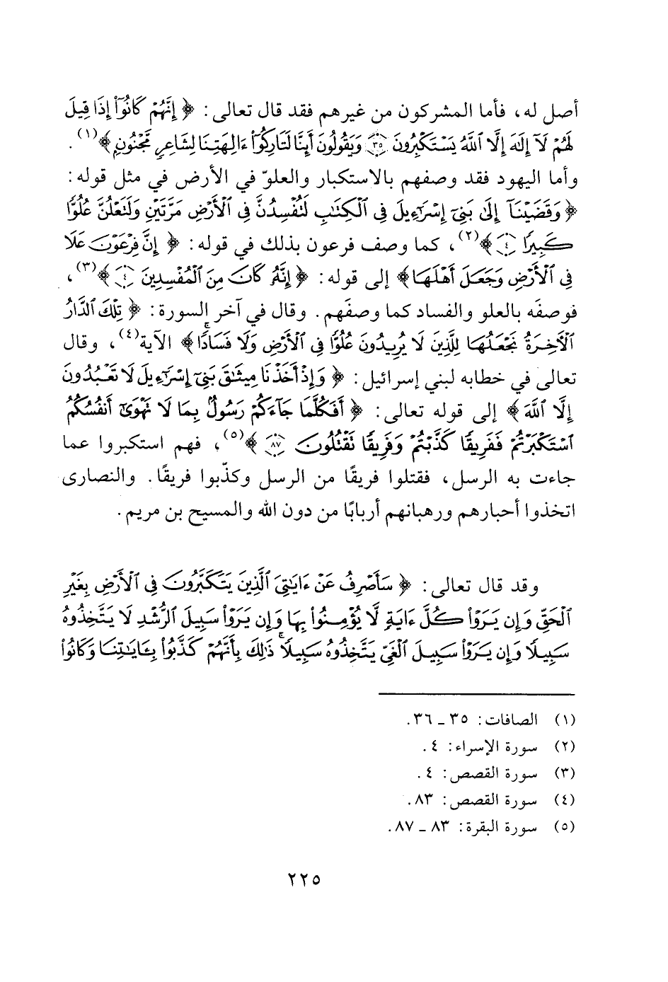 وأما اليهود فقد وصفهم بالاستكبار والعلوّ في الأرض في مثل قوله: (وَقَضَيْنَا إِلَى بَنِي إِسْرَائِيلَ فِي الْكِتَابِ لَتُفْسِدُنَّ فِي الْأَرْضِ مَرَّتَيْنِ وَلَتَعْلُنَّ عُلُوًّا كَبِيرًا (4)) (2)، كما وصف فرعون بذلك في قوله: (إِنَّ فِرْعَوْنَ عَلَا فِي الْأَرْضِ وَجَعَلَ أَهْلَهَا) إلى قوله: (إِنَّهُ كَانَ مِنَ الْمُفْسِدِينَ (4)) (3)، فوصفَه بالعلو والفساد كما وصفَهم. وقال في اَخر السورة: (تِلْكَ الدَّارُ الْآَخِرَةُ نَجْعَلُهَا لِلَّذِينَ لَا يُرِيدُونَ عُلُوًّا فِي الْأَرْضِ وَلَا فَسَادًا) الاَية (4)، وقال تعالى في خطابه لبني إسرائيل: (وَإِذْ أَخَذْنَا مِيثَاقَ بَنِي إِسْرَائِيلَ لَا تَعْبُدُونَ إِلَّا اللَّهَ) إلى قوله تعالى: (أَفَكُلَّمَا جَاءَكُمْ رَسُولٌ بِمَا لَا تَهْوَى أَنْفُسُكُمُ اسْتَكْبَرْتُمْ فَفَرِيقًا كَذَّبْتُمْ وَفَرِيقًا تَقْتُلُونَ (87)) (5)، فهم استكبروا عما جاءت به الرسل، فقتلوا فريقًا من الرسل وكذّبوا فريقًا. والنصارى اتخذوا أحبارهم ورهبانهم أربابًا من دون الله والمسيح بن مريم.