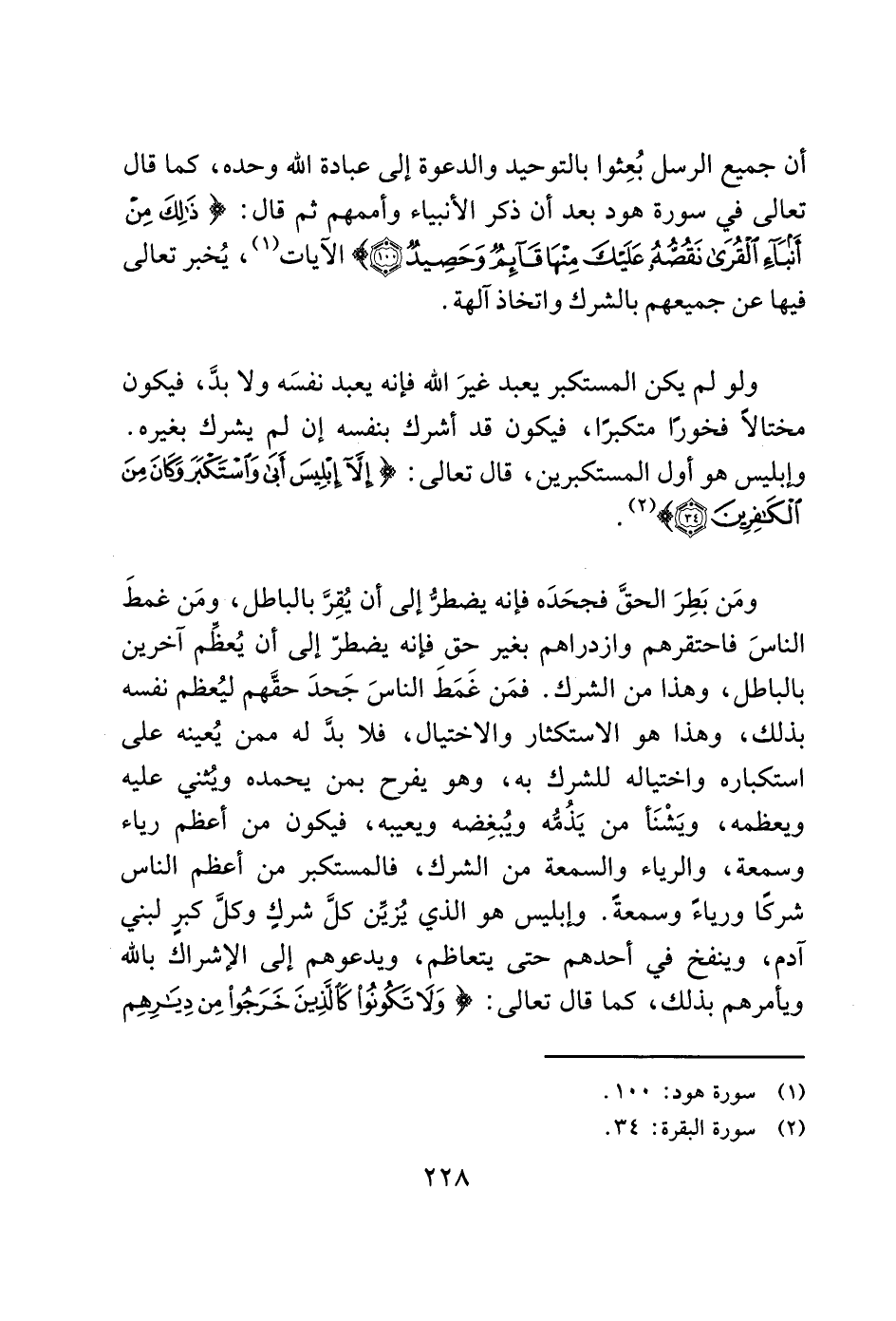 ولو لم يكن المستكبر يعبد غيرَ الله فإنه يعبد نفسَه ولا بدَّ، فيكون مختالاً فخورًا متكبرًا، فيكون قد أشرك بنفسه إن لم يشرك بغيره. وإبليس هو أول المستكبرين، قال تعالى: (إِلَّا إِبْلِيسَ أَبَى وَاسْتَكْبَرَ وَكَانَ مِنَ الْكَافِرِينَ (34)) (2).