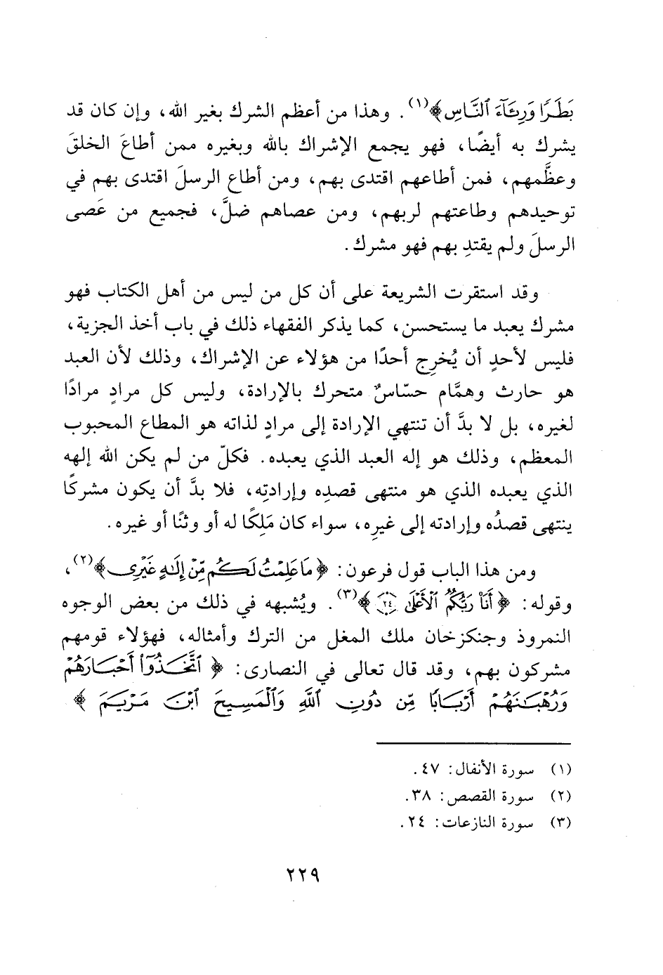 وقد استقرت الشريعة على أن كل من ليس من أهل الكتاب فهو مشرك يعبد ما يستحسن، كما يذكر الفقهاء ذلك في باب أخذ الجزية، فليس لأحدٍ أن يُخرِج أحدًا من هؤلاء عن الإشراك، وذلك لأن العبد هو حارث وهمَّام حسّاس متحرك بالإرادة، وليس كل مرادٍ مرادًا لغيره، بل لا بدَّ أن تنتهي الإرادة إلى مرادٍ لذاته هو المطاع المحبوب المعظم، وذلك هو إله العبد الذي يعبده. فكلّ من لم يكن الله إلهه الذي يعبده الذي هو منتهى قصدِه وإرادتِه، فلا بدَّ أن يكون مشركًا ينتهى قصدُه وإرادته إلى غيرِه، سواء كان مَلِكًا له أو وثنًا أو غيره.