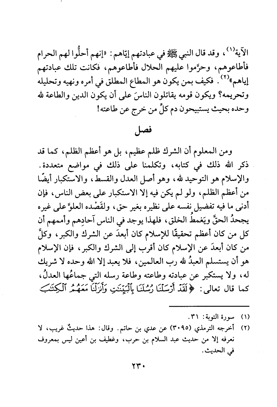 ومن المعلوم أن الشرك ظلم عظيم، بل هو أعظم الظلم، كما قد ذكر الله ذلك في كتابه، وتكلمنا على ذلك في مواضع متعددة. والإسلام هو التوحيد لله، وهو أصل العدل والقسط، والاستكبار أيضًا من أعظم الظلم، ولو لم يكن فيه إلا الاستكبار على بعض الناس، فإن أدنى ما فيه تفضيل نفسه على نظيره بغير حق، ولقَصْده العلوَّ على غيره يجحدُ الحقَّ ويَغمطُ الخلق، فلهذا يوجد في الناس اَحادِهم وأممهم أن كل من كان أعظم تحقيقا للإسلام كان أبعدَ عن الشرك والكبر، وكلَّ من كان أبعدَ عن الإسلام كان أقرب إلى الشرك والكبر، فإن الإسلام هو أن يستسلم العبدُ لله رب العالمين، فلا يعبد إلا الله وحده لا شريك له، ولا يستكبر عن عبادته وطاعته وطاعة رسله التي جماعُها العدلُ، كما قال تعالى: (لَقَدْ أَرْسَلْنَا رُسُلَنَا بِالْبَيِّنَاتِ وَأَنْزَلْنَا مَعَهُمُ الْكِتَابَ