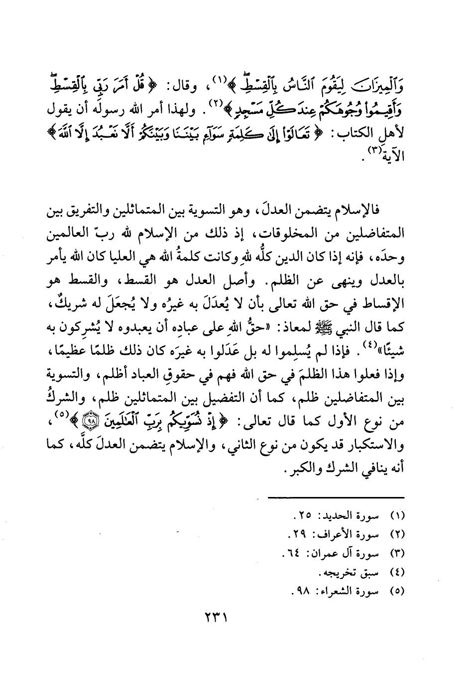 وَالْمِيزَانَ لِيَقُومَ النَّاسُ بِالْقِسْطِ) (1)، وقال: (قُلْ أَمَرَ رَبِّي بِالْقِسْطِ وَأَقِيمُوا وُجُوهَكُمْ عِنْدَ كُلِّ مَسْجِدٍ) (2). ولهذا أمر الله رسولَه أن يقول لأهل الكتاب: (تَعَالَوْا إِلَى كَلِمَةٍ سَوَاءٍ بَيْنَنَا وَبَيْنَكُمْ أَلَّا نَعْبُدَ إِلَّا اللَّهَ) الاَيةَ (3).