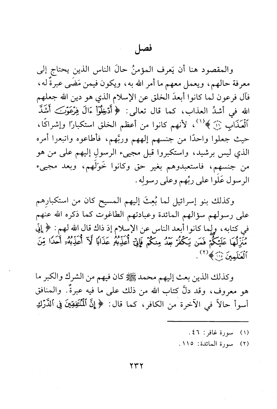 والمقصود هنا أن يَعرف المؤمنُ حالَ الناس الذينِ يحتاج إلى معرفة حالهم، ويعمل معهم ما أمر الله به، ويكون فيمن مَضى عبرةٌ له، فآل فرعون لما كانوا أبعدَ الخلق عن الإسلام الذي هو دين الله جعلهم الله في أشدِّ العذاب، كما قال تعالى: (أَدْخِلُوا آَلَ فِرْعَوْنَ أَشَدَّ الْعَذَابِ (46)) (1)، لأنهم كانوا من أعظم الخلق استكبارًا وإشراكًا، حيث جعلوا واحدًا من جنسهم إلههم وربَّهم، فأطاعوه واتبعوا أمره الذي ليس برشيد، واستكبروا قبل مجيئ الرسولِ إليهم على من هو من جنسهم، فاستعبدوهم بغير حق وكانوا خَوَلَهم، وبعد مجيئ الرسول عَلَوا على ربِّهم وعلى رسوله.