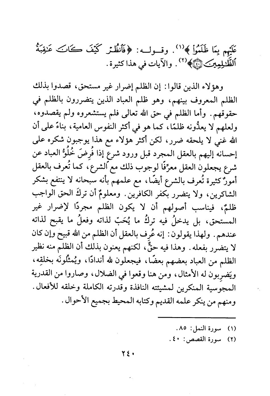 وهؤلاء الذين قالوا: إن الظلم إضرار غير مستحق، قصدوا بذلك الظلم المعروف بينهم، وهو ظلم العباد الذين يتضررون بالظلم في حقوقهم. وأما الظلم في حق الله تعالى فلم يستشعروه ولم يقصدوه، ولعلهم لا يعدُّونه ظلمًا، كما هو في أكثر النفوس العامية، بناءً على أن الله غني لا يلحقه ضرر، لكن أكثر هؤلاء مع هذا يوجبون شكره على إحسانه إليهم بالعقل المجرد قبل ورود شرع إذا فُرِضَ خُلُوُّ العباد عن شرع يجعلون العقل معرِّفًا لوجوب ذلك معً الشرع، كما تُعرف بالعقل أمورٌ كثيرة تُعرف بالشرع أيضًا، مع علمهم بأنه سبحانه لا ينتفع بشكر الشاكرين، ولا يتضرر بكفر الكافرين. ومعلومٌ أن تركَ الحق الواجب ظلمٌ، فيناسب أصولهم أن لا يكون الظلم مجردًا لإضرار غير المستحق، بل يدخلُ فيه تركُ ما يُحَبّ لذاته وفعلُ ما يقبح لذاته عندهم. ولهذا يقولون: إنه عُرِف بالعقل أن الظلم من الله قبيح وإن كان لا يتضرر بفعله. وهذا فيه حقٌّ، لكنهم يعنون بذلك أن الظلم منه نظير الظلم من العباد بعضهم بعضًا، فيجعلون لله أندادًا، ويُمثلّونَه بخلقِه، ويَضرِبون له الأمثال، ومن هنا وقعوا في الضلال، وصاروا من القدرية المجوسية المنكرين لمشيئته النافذة وقدرته الكاملة وخلقه للأفعال. ومنهم من ينكر علمه القديم وكتابه المحيط بجميع الأحوال.