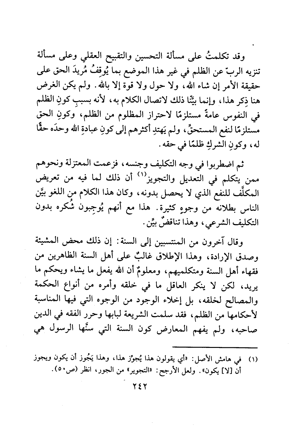 وقد تكلمتُ على مسألة التحسين والتقبيح العقلي وعلى مسألة تنزيه الربّ عن الظلم في غير هذا الموضع بما يُوقِفُ مُريدَ الحق على حقيقة الأمر إن شاء الله، ولا حول ولا قوة إلا بالله. ولم يكن الغرض هنا ذِكر هذا، وإنما بيَّنّا ذلك لاتصال الكلام به، لأنه بسبب كونِ الظلم في النفوس عامةً مستلزمًا لاحتراز المظلوم من الظلم، َ وكونِ الحق مستلزمًا لنفع المستحقِّ، ولم يَهتدِ أكثرهم إلى كونِ عبادةِ الله وحدَه حقاً له، وكونِ الشركِ ظلمًا في حقه.