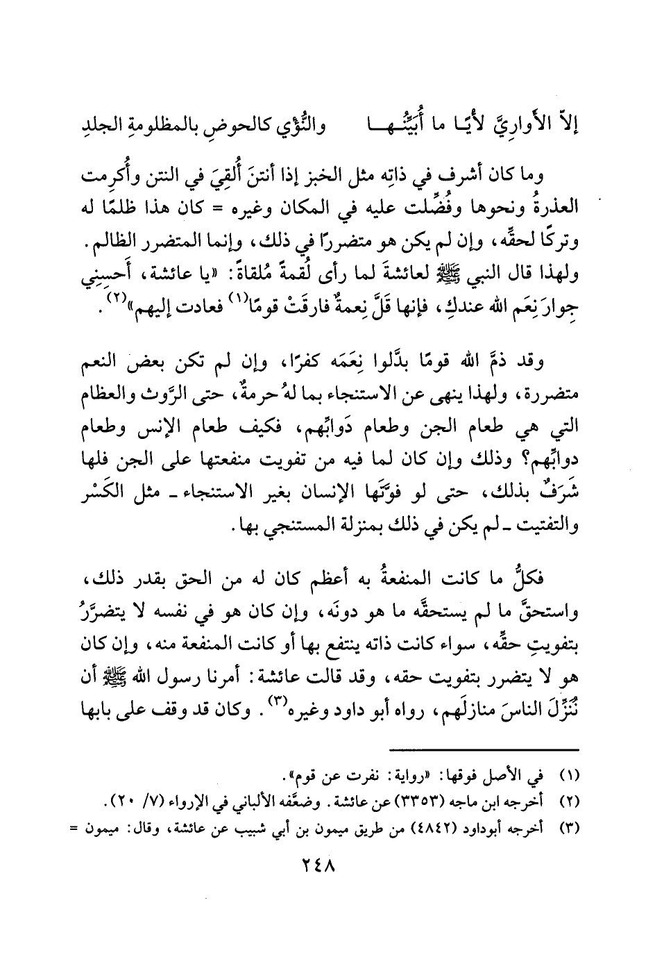 وما كان أشرف في ذاتِه مثل الخبز إذا أنتنَ أُلقِيَ في النتن وأُكرِمت العذرةُ ونحوها وفُضلت عليه في المكان وغيره= كان هذا ظلمًا له وتركًا لحقِّه، وإن لم يكن هو متضررًا في ذلك، وإنما المتضرر الظالم. ولهذا قال النبي - صَلَّى اللَّهُ عَلَيْهِ وَسَلَّمَ - لعائشةَ لما رأى لُقمةً مُلقاةً: "يا عائشة، أَحسنِي جِوارَ نِعَم الله عندكِ، فإنها قَلَّ نِعمةٌ فارقَتْ قومًا (1) فعادت إليهم " (2).
