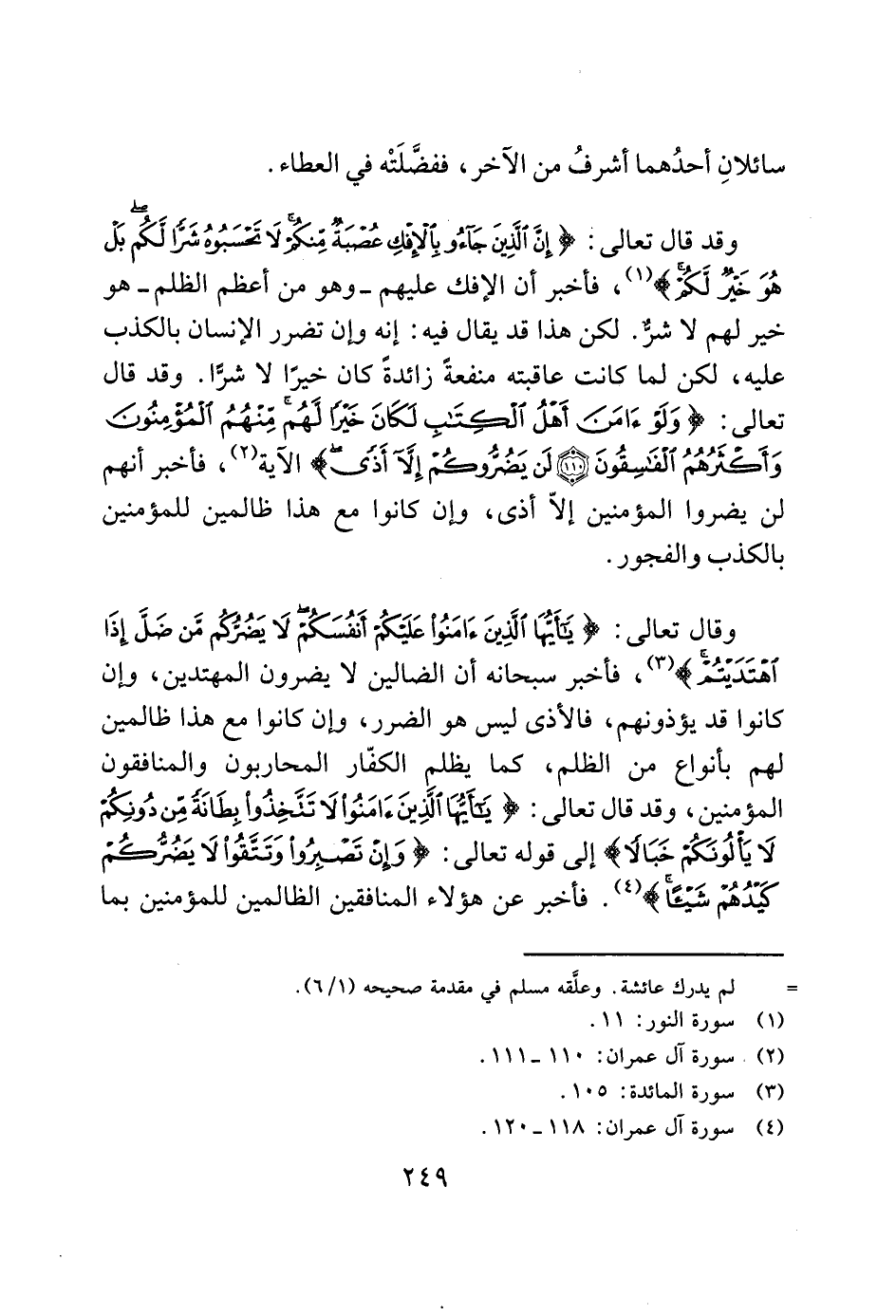 وقالي تعالى: (يَا أَيُّهَا الَّذِينَ آَمَنُوا عَلَيْكُمْ أَنْفُسَكُمْ لَا يَضُرُّكُمْ مَنْ ضَلَّ إِذَا اهْتَدَيْتُمْ) (3)، فأخبر سبحانه أن الضالين لا يضرون المهتدين، وإن كانوا قد يؤذونهم، فالأذى ليس هو الضرر، وإن كانوا مع هذا ظالمين لهم بأنواع من الظلم، كما يظلم الكفّار المحاربون والمنافقون المؤمنين، وقد قال تعالى: (يَا أَيُّهَا الَّذِينَ آَمَنُوا لَا تَتَّخِذُوا بِطَانَةً مِنْ دُونِكُمْ لَا يَأْلُونَكُمْ خَبَالًا) إلى قوله تعالى: (وَإِنْ تَصْبِرُوا وَتَتَّقُوا لَا يَضُرُّكُمْ كَيْدُهُمْ شَيْئًا) (4). فأخبر عن هؤلاء المنافقين الظالمين للمؤمنين بما