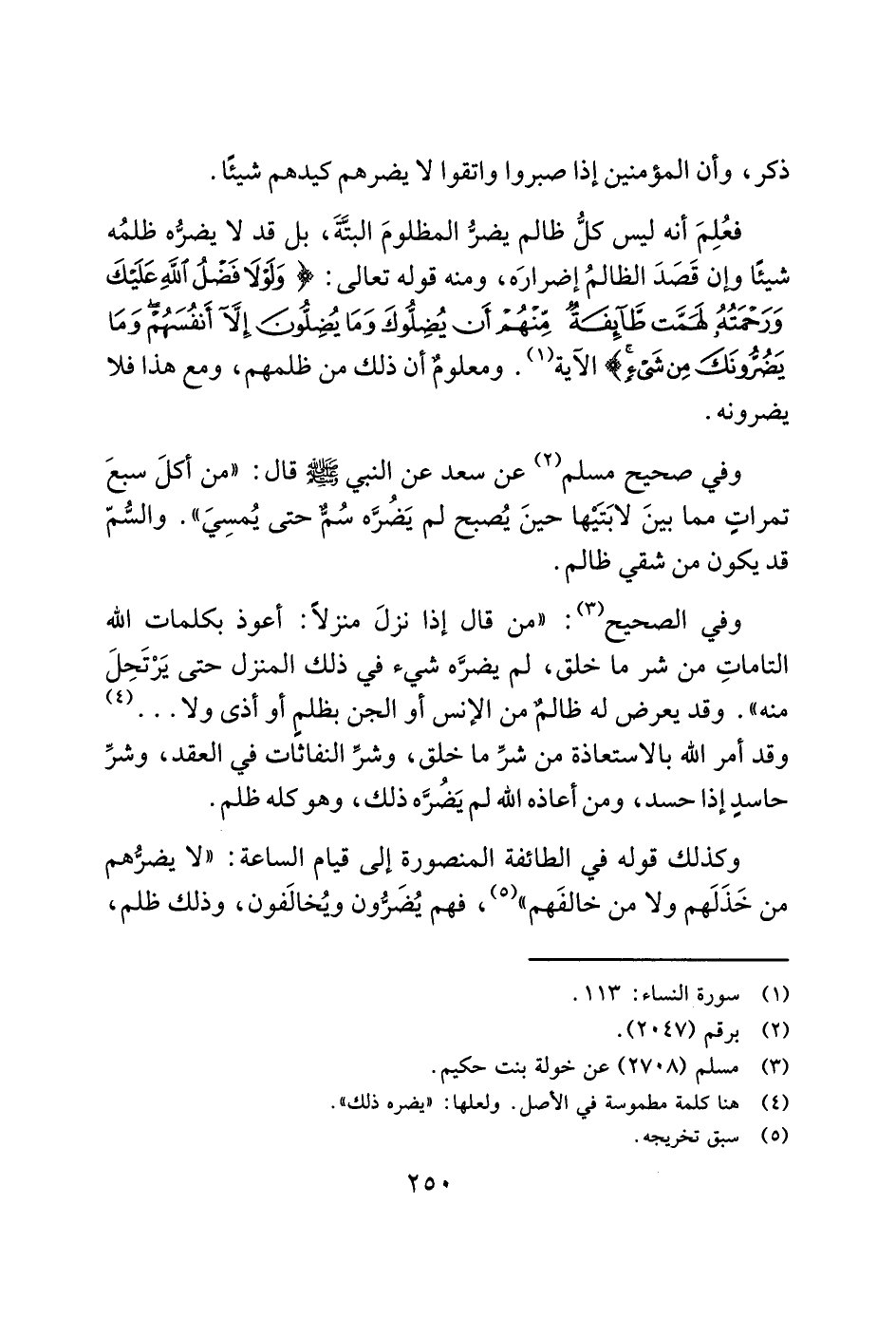 فعُلِمَ أنه ليس كلُّ ظالم يضرُّ المظلومَ البتةَ، بل قد لا يضرُّه ظلمُه شيئًا وإن قَصَدَ الظالمُ إضرارَه، ومنه قوله تعالى: (وَلَوْلَا فَضْلُ اللَّهِ عَلَيْكَ وَرَحْمَتُهُ لَهَمَّتْ طَائِفَةٌ مِنْهُمْ أَنْ يُضِلُّوكَ وَمَا يُضِلُّونَ إِلَّا أَنْفُسَهُمْ وَمَا يَضُرُّونَكَ مِنْ شَيْءٍ) الاَية (1). ومعلومٌ أن ذلك من ظلمهم، ومع هذا فلا يضرونه.