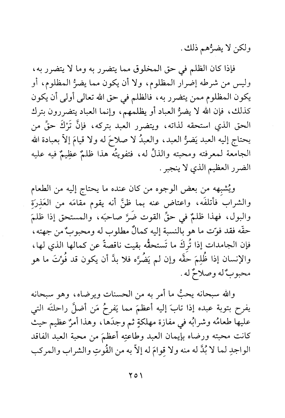 فإذا كان الظلم في حق المخلوق مما يتضرر به وما لا يتضرر به، وليس من شرطه إضرار المظلوم، ولا أن يكون مما يضرُّ المظلوم، أو يكون المظلوم ممن يتضرر به، فالظلم في حق الله تعالى أولى أن يكون كذلك، فإن الله لا يضرُّ العباد أو يظلمهم، وإنما العباد يتضررون بترك الحق الذي استحقه لذاته، ويتضرر العبد بتركه، فإنَّ تَرْكَ حقِّ من يحتاج إليه العبد يَضرُّ العبد، والعبدُ لا صلاحَ له ولا قيامَ إلاّ بعبادة الله الجامعة لمعرفته ومحبته والذلِّ له، فتفويتُه هذا ظلمٌ عظِيمٌ فيه عليه الضرر العظيم الذي لا ينجبر.