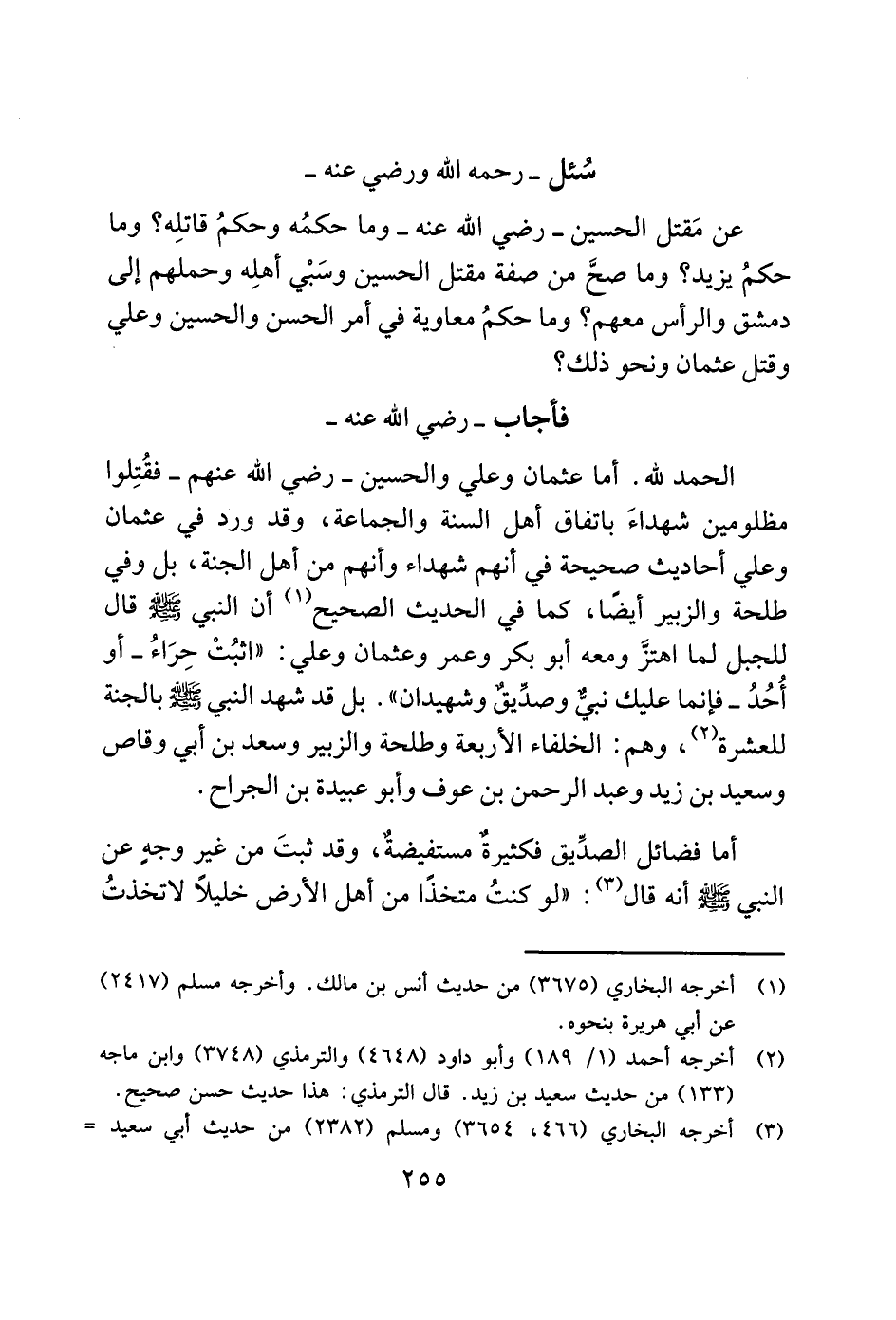 الحمد لله. أما عثمان وعلي والحسين- رضي الله عنهم- فقُتِلوا مظلومين شهداءَ باتفاق أهل السنة والجماعة، وقد ورد في عثمان وعلي أحاديث صحيحة في أنهم شهداء وأنهم من أهل الجنة، بل وفي طلحة والزبير أيضا، كما في الحديث الصحيح (1) أن النبي - صَلَّى اللَّهُ عَلَيْهِ وَسَلَّمَ - قال للجبل لما اهتزَّ ومعه أبو بكر وعمر وعثمان وعلي: "اثبُتْ حِرَاءُ- أو أُحُدُ- فإنما عليك نبيٌّ وصدّيقٌ وشهيدان ". بل قد شهد النبي - صَلَّى اللَّهُ عَلَيْهِ وَسَلَّمَ - بالجنة للعشرة (2)، وهم: الخلفاء الأربعة وطلحة والزبير وسعد بن أبي وقاص وسعيد بن زيد وعبد الرحمن بن عوف وأبو عبيدة بن الجراح.