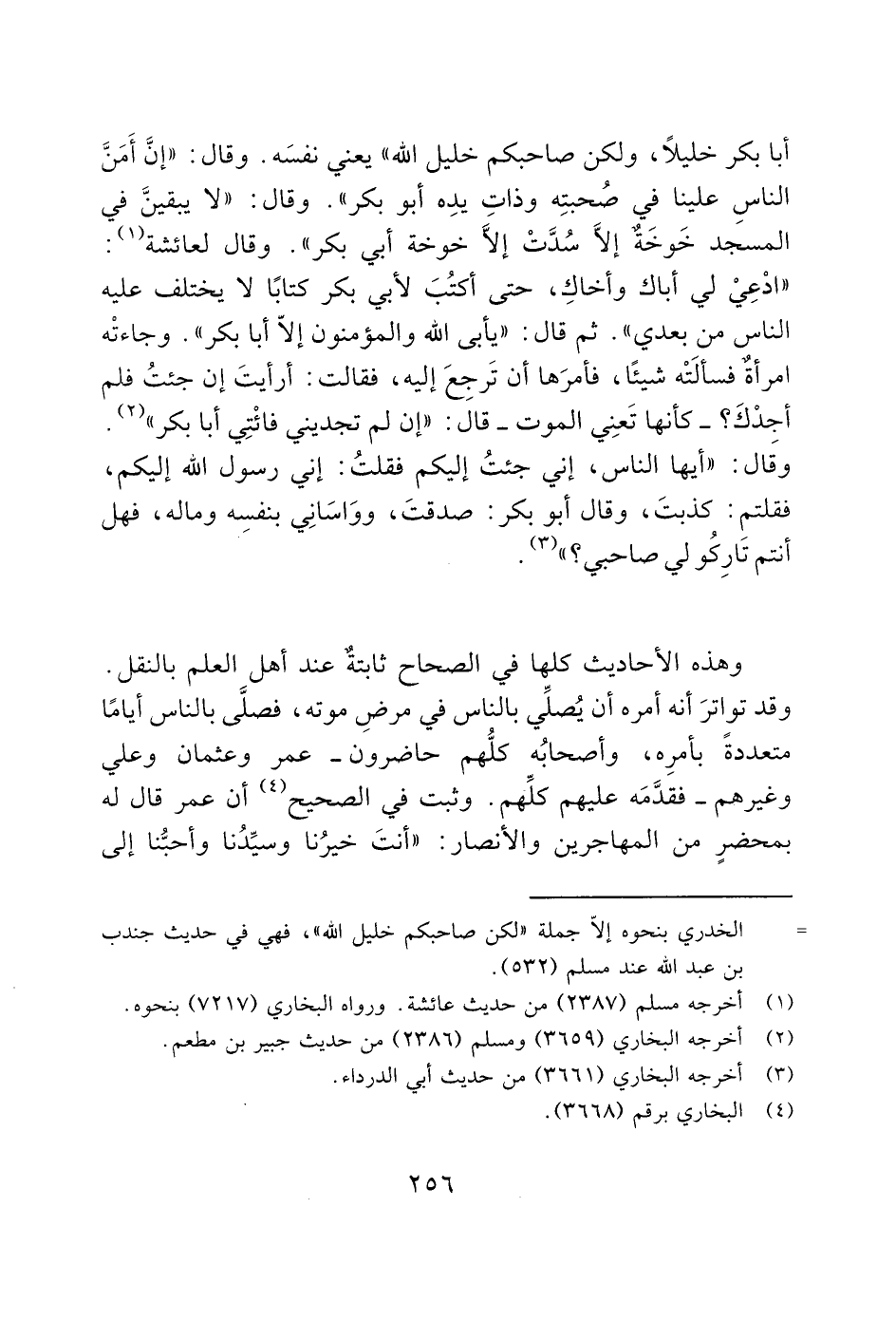 أبا بكر خليلاً، ولكن صاحبكم خليل الله " يعني نفسَه. وقال: "إنَّ أَمَنَّ الناسِ علينا في صُحبتِه وذاتِ يدِه أبو بكر". وقال: "لا يبقينَّ في المسجد خَوخَة إلأَ سُدَّتْ إلأَ خوخة أبي بكر". وقال لعائشة (1): "ادْعِيْ لي أباك وأخاكِ، حتى أكتُبَ لأبي بكر كتابًا لا يختلف عليه الناس من بعدي ". ثم قال: "يأبي الله والمؤمنون إلاّ أبا بكر". وجاءتْه امرأة فسألَتْه شيئًا، فأمرَها أن تَرجعَ إليه، فقالت: أرأيتَ إن جئتُ فلم أجدْكَ؟ - كأنها تَعنِي الموت- قالَ: "إن لم تجديني فائْتِي أبا بكر" (2). وقَال: "أيها الناس، إني جئتُ إليكم فقلتُ: إني رسول الله إليكم، فقلتم: كذبتَ، وقال أبو بكر: صدقتَ، ووَاسَانِي بنفسِه وماله، فهل أنتم تَارِكُو لي صاحبي؟ " (3).