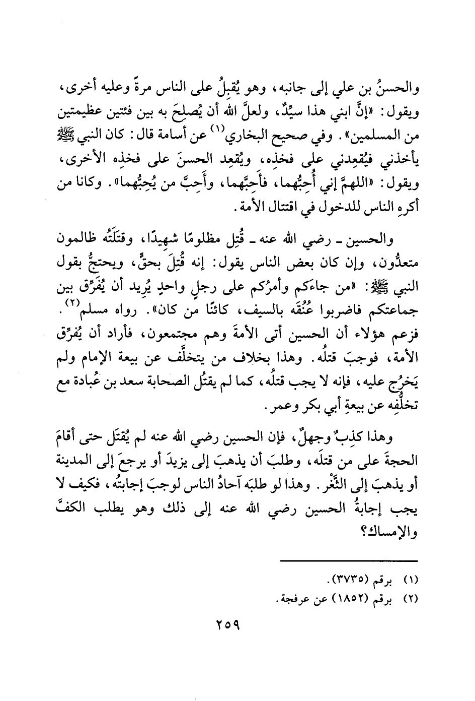 والحسنُ بن علي إلى جانبه، وهو يُقبلُ على الناس مرةً وعليه أخرى، ويقول: "إنَّ ابني هذا سيد، ولعلَّ الله أن يُصلحَ به بين فئتين عظيمتين من المسلمين ". وفي صحيح البخاري (1) عن أسامة قال: كان النبي - صَلَّى اللَّهُ عَلَيْهِ وَسَلَّمَ - يأخذني فيُقعِدني على فخذِه، ويُقعِد الحسنَ على فخذِه الأخرى، ويقول: "اللهمَ إني أحِبُّهما، فأَحبهما، وأَحِبَّ من يُحِبُّهما". وكانا من أكرهِ الناس للدخول في اقتتال الأَمة.