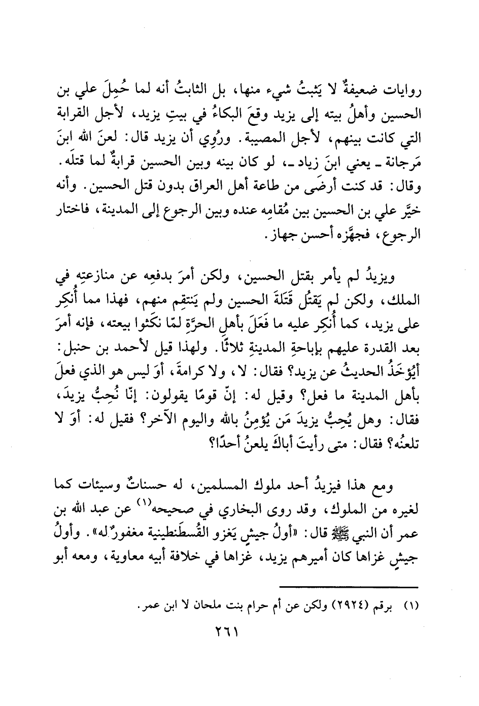 ويزيدُ لم يأمر بقتل الحسين، ولكن أمرَ بدفعِه عن منازعتِه في الملك، ولكن لم يَقتُل قَتَلةَ الحسين ولم يَنتقِم منهم، فهذا مما أُنكِر على يزيد، كما أُنكِر عليه ما فَعَلَ بأهلِ الحرَّةِ لمّا نكَثوا بيعته، فإنه أمرَ بعد القدرة عليهم بماباحةِ المدينةِ ثلاثًا. ولهذا قيل لأحمد بن حنبل: أيُؤخَذُ الحديثُ عن يزيد؟ فقال: لا، ولا كرامةَ، أوَ ليس هو الذي فعلَ باهل المدينة ما فعل؟ وقيل له: إنّ قومًا يقولون: إنّا نُحِبُّ يزيدَ، فقال: وهل يُحِبُّ يزيدَ مَن يُؤمِنُ بالله واليوم الآخر؟ فقيل له: أوَ لا تلعنُه؟ فقال: متى رأيتَ أباكَ يلعنُ أحدًا؟
