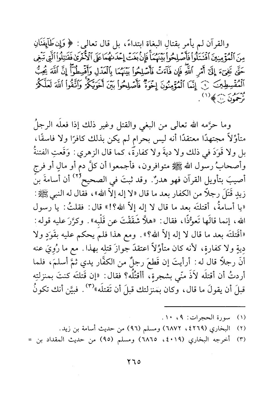 وما حرَّمه الله تعالى من البغي والقتل وغير ذلك إذا فعلَه الرجلُ متأوِّلاً مجتهدًا معتقدًا أنه ليس بحرامٍ لم يكن بذلك كافرًا ولا فاسقًا، بل ولا قَوَدَ في ذلك ولا ديةَ ولا كفارة، كما قال الزهري: وَقَعتِ الفتنةُ وأصحابُ رسول الله - صَلَّى اللَّهُ عَلَيْهِ وَسَلَّمَ - متوافرون، فأجمعوا أن كلَّ دم أو مالٍ أو فرجٍ أصيبَ بتأويل القرآن فهو هدر. وقد ثبتَ في الصحيح (2) أن أسامةَ بن زيدٍ قَتَلَ رجلاً من الكفار بعد ما قال "لا إله إلاّ الله "، فقال له النبي - صَلَّى اللَّهُ عَلَيْهِ وَسَلَّمَ -: "يا أسامةُ، أقتلتَه بعد ما قال لا إله إلاّ الله؟! " قال؟ فقلتُ: يا رسول الله، إنما قالَها تَعوُّذًا، فقال: "هلاَّ شَقَقْتَ عن قَلْبه". وكرَّرَ عليه قوله: "أقَتلتَه بعد ما قال لا إله إلاّ الله؟ ". ومع هذا فلمَ يحكم عليه بقَوَدٍ ولا دِيةٍ ولا كفارةٍ، لأنه كان متأوِّلاً اعتقدَ جوازَ قتلِه بهذا. مع ما رُوِيَ عنه أنّ رجلاً قال له: أرأيتَ إن قَطعَ رجل من الكفَّار يدي ثمَّ أسلمَ، فلما أردتُ أن أقتلَه لاَذَ منّي بشجرةٍ، أأقتُلُه؟ فقال: "إن قَتلتَه كنتَ بمنزلتِه قبلَ أن يقولَ ما قال، وكان بمنزلتك قبلَ أن تَقتلَه " (3). فبيَّن أنك تكونُ