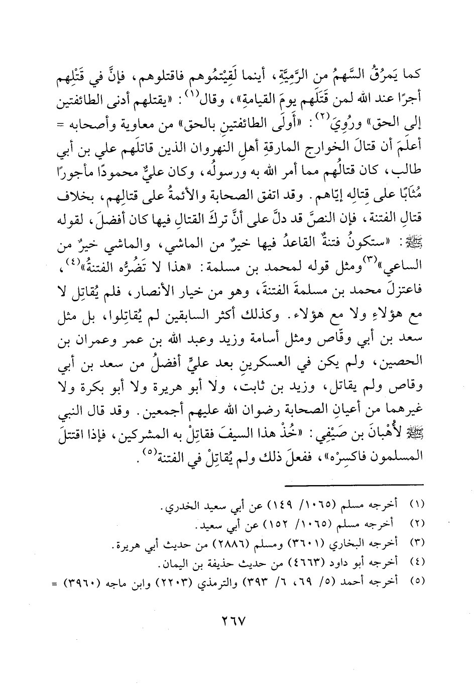 كما يَمرُقُ السَّهمُ من الرَّمِيَّةِ، أينما لَقِيْتمُوهم فاقتلوهم، فإنَّ في قَتْلِهم أجرًا عند الله لمن قَتَلَهم يومَ القيامةِ"، وقال (1): "يقتلهم أدنى الطائفتين إلى الحق " ورُوِيَ (2): "أَولَى الطائفتينِ بالحق " من معاوية وأصحابه- أعلَمَ أن قتالَ الخوارج المارقةِ أهلِ النهروان الذين قاتلَهم علي بن أبي طالب، كان قتالُهم مما أمر الله به ورسولُه، وكان عليّ محمودًا مأجورًا مُثَابًا على قِتالِه إيّاهم. وقد اتفق الصحابة والأئمةُ على قتالِهم، بخلاف قتالِ الفتنة، فإن النصَّ قد دلَّ على أنَ تركَ القتالِ فيها كان أفضلَ، لقوله - صَلَّى اللَّهُ عَلَيْهِ وَسَلَّمَ -:" ستكونُ فتنة القاعدُ فيها خير من الماشي، والماشي خير من الساعي " (3) ومثل قوله لمحمد بن مسلمة: "هذا لا تَضُرُّه الفتنةُ" (4)، فاعتزلَ محمد بن مسلمةَ الفتنةَ، وهو من خيار الأنصار، فلم يُقاتِل لا مع هؤلاءِ ولا مع هؤلاء. وكذلك أكثر السابقين لم يُقاتِلوا، بل مثل سعد بن أبي وقّاص ومثل أسامة وزيد وعبد الله بن عمر وعمران بن الحصين، ولم يكن في العسكرينِ بعد عليٍّ أفضلُ من سعد بن أبي وقاص ولم يقاتل، وزيد بن ثابت، ولا أبو هريرة ولا أبو بكرة ولا غيرهما من أعيانِ الصحابة رضوان الله عليهم أجمعين. وقد قال النبي - صَلَّى اللَّهُ عَلَيْهِ وَسَلَّمَ - لأهْبانَ بن صَيْفِي: "خُذْ هذا السيفَ فقاتِلْ به المشركين، فإذا اقتتلَ المسلمون فاكسِرْه"، ففعلَ ذلك ولم يُقاتِلْ في الفتنة (5).