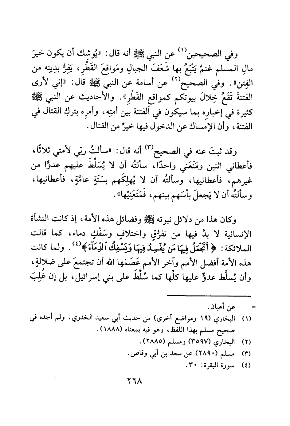 وفي الصحيحين (1) عن النبي - صَلَّى اللَّهُ عَلَيْهِ وَسَلَّمَ - أنه قال: "يُوشِك أن يكون خيرَ مالِ المسلم غنمٌ يَتبعُ بها شَعَفَ الجبالِ ومَواقع القَطْرِ، يَفِرُّ بدِينه من الفِتن ". وفي الصحيح (2) عن أسامة عن النبي - صَلَّى اللَّهُ عَلَيْهِ وَسَلَّمَ - قال: "إني لأرى الفتنةَ تَقَعُ خِلالَ بيوتكم كمواقع القَطْرِ". والأحاديث عن النبي - صَلَّى اللَّهُ عَلَيْهِ وَسَلَّمَ - كثيرة في إخبارِه بما سيكون في الفتنة بين أمتِه، وأمرِه بتركِ القتال في الفتنة، وأن الإمساك عن الدخول فيها خيرٌ من القتال.