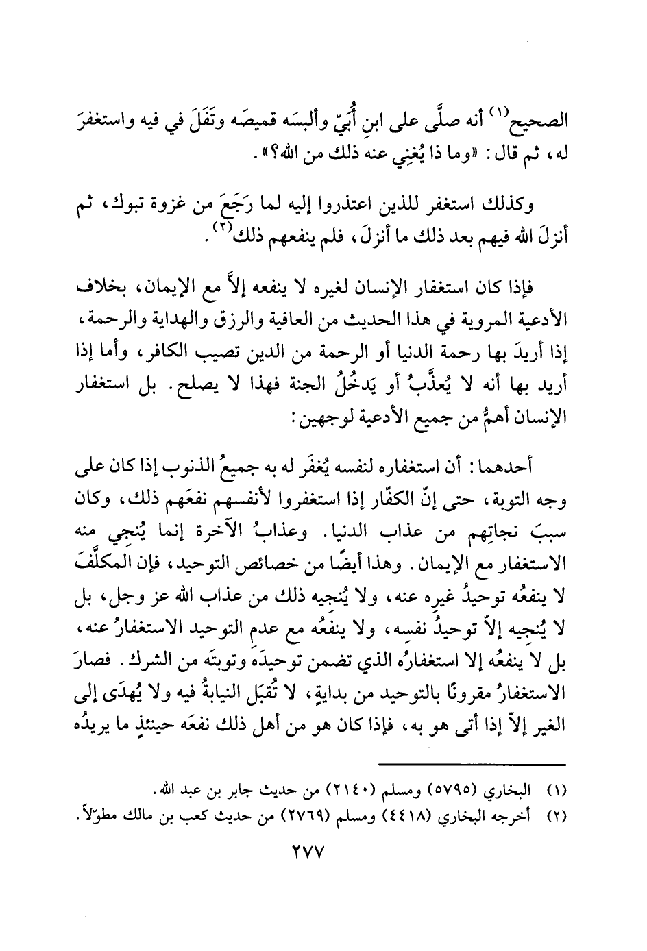 أحدهما: أن استغفاره لنفسه يُغفَر له به جميعُ الذنوب إذا كان على وجه التوبة، حتى إنّ الكفّار إذا استغفروا لأنفسهم نفعَهم ذلك، وكان سببَ نجاتِهم من عذاب الدنيا. وعذابُ الآخرة إنما يُنجي منه الاستغفار مع الإيمان. وهذا أيضًا من خصائص التوحيد، فإن اَلمكلَّفَ لا ينفعُه توحيدُ غيرِه عنه، ولا يُنجِيه ذلك من عذاب الله عز وجل، بل لا يُنجيه إلاّ توحيدُ نفسِه، ولا ينفعُه مع عدمِ التوحيد الاستغفارُ عنه، بل لاَ ينفعُه إلا استغفارُه الذي تضمن توحيدَه وتوبتَه من الشرك. فصارَ الاستغفارُ مقرونًا بالتوحيد من بدايةٍ، لا تُقبَل النيابةُ فيه ولا يُهدَى إلى الغير إلاّ إذا أتى هو به، فإذا كان هو من أهل ذلك نفعَه حينئذٍ ما يريدُه