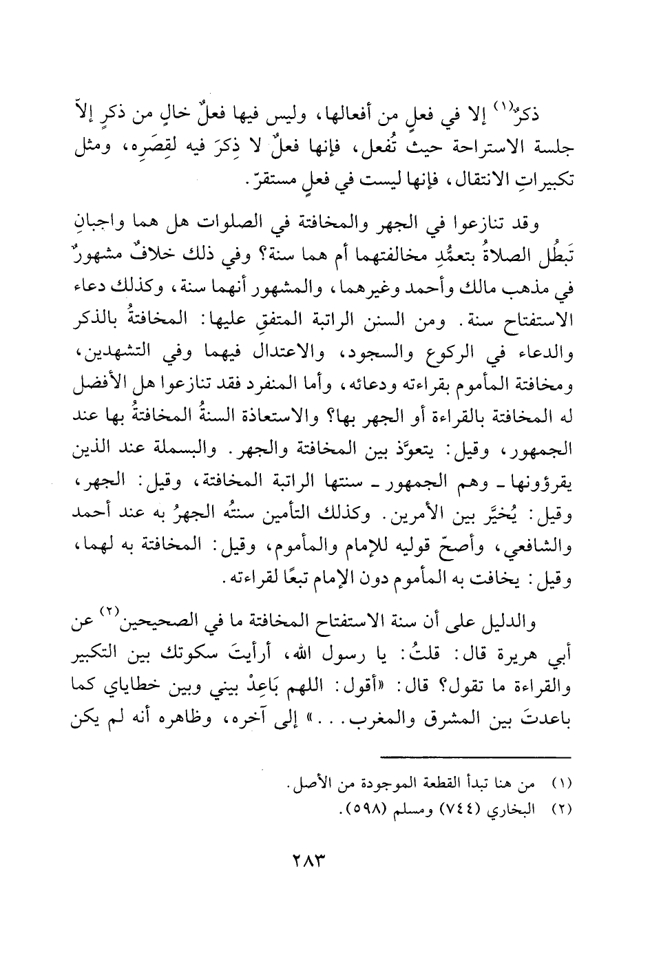 والدليل على أن سنة الاستفتاح المخافتة ما في الصحيحين (2) عن أبي هريرة قال: قلتُ: يا رسول الله، أرأيتَ سكوتك بين التكبير والقراءة ما تقول؟ قال: "أقول: اللهم بَاعِدْ بيني وبين خطاياي كما باعدتَ بين المشرق والمغرب…" إلى آخره، وظاهره أنه لم يكن