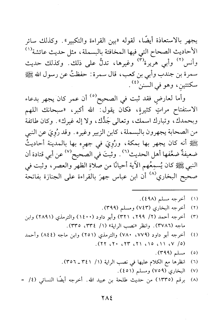 وأما لعارضٍ فقد ثبت في الصحيح (5) أن عمر كان يجهر بدعاء الاستفتاح مراتٍ كثيرةٍ، فكان يقول: الله أكبر، "سبحانك اللهم وبحمدك، وتبارك اسمك، وتعالى جَدُّك، ولا إله غيرك". وكان طائفة من الصحابة يجهرون بالبسملة، كابن الزبير وغيره. وقد رُوِيَ عن النبي - صَلَّى اللَّهُ عَلَيْهِ وَسَلَّمَ - أنه كان يجهر بها بمكة، ورُوِيَ في جهرِه بها بالمدينة أحاديثُ ضعيفةٌ ضعَّفها أهل الحديث (6). وثبتَ في الصحيح (7) عن أبي قتادة أن النبي - صَلَّى اللَّهُ عَلَيْهِ وَسَلَّمَ - كان يُسمِعُهم الآية أحيانًا من صلاةِ الظهر والعصر، وثبت في صحيح البخاري (8) أن ابن عباس جهرَ بالقراءة على الجنازة بفاتحة