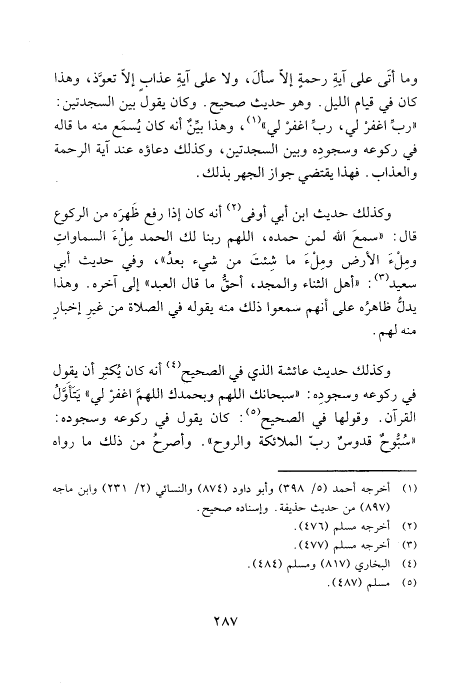 وما أتَى على آيةِ رحمةٍ إلا سألَ، ولا على آيةِ عذاب إلا تعوَّذ، وهذا كان في قيام الليل. وهو حديث صحيح. وكان يقول بين السجدتين: "ربِّ اغفرْ لي، ربِّ اغفرْ لي" (1)، وهذا بيِّنٌ أنه كان يُسمَع منه ما قاله في ركوعه وسجودِه وبين السجدتين، وكذلك دعاؤه عند آية الرحمة والعذاب. فهذا يقتضي جواز الجهر بذلك.