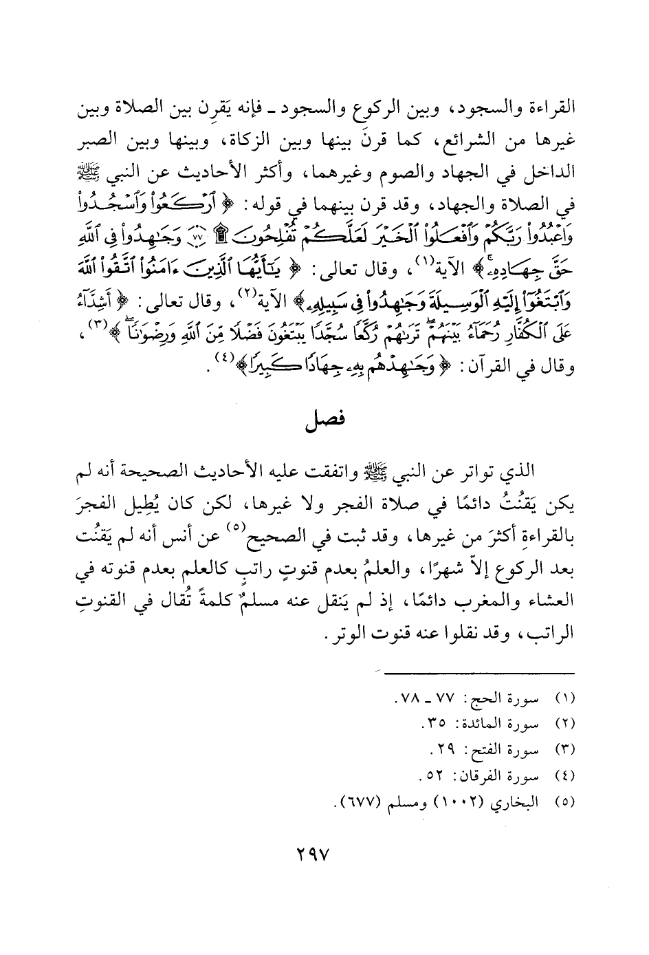 القراءة والسجود، وبين الركوِع والسجود- فإنه يَقرِن بين الصلاة وبين غيرها من الشرائع، كما قرن بينها وبين الزكاة، وبينها وبين الصبر الداخل في الجهاد والصوم وغيرهما، وأكثر الأحاديث عن النبي - صَلَّى اللَّهُ عَلَيْهِ وَسَلَّمَ - في الصلاة والجهاد، وقد قرن بينهما فى قوله: (ارْكَعُوا وَاسْجُدُوا وَاعْبُدُوا رَبَّكُمْ وَافْعَلُوا الْخَيْرَ لَعَلَّكُمْ تُفْلِحُونَ (77) وَجَاهِدُوا فِي اللَّهِ حَقَّ جِهَادِهِ) هو الآية (1)، وقال تعالى: (يَا أَيُّهَا الَّذِينَ آَمَنُوا اتَّقُوا اللَّهَ وَابْتَغُوا إِلَيْهِ الْوَسِيلَةَ وَجَاهِدُوا فِي سَبِيلِهِ) الآية (2)، وقال تعالى: (عَلَى الْكُفَّارِ رُحَمَاءُ بَيْنَهُمْ تَرَاهُمْ رُكَّعًا سُجَّدًا يَبْتَغُونَ فَضْلًا مِنَ اللَّهِ وَرِضْوَانًا) (3)، وقال في القرآن: (وَجَاهِدْهُمْ بِهِ جِهَادًا كَبِيرًا) (4).
