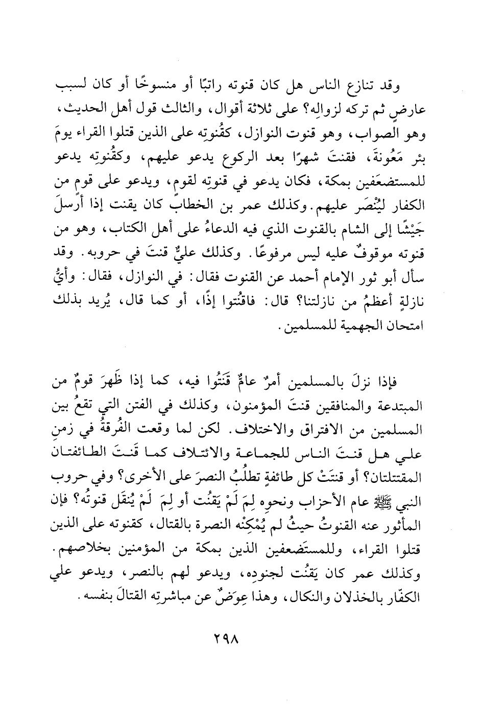 فإذا نزل بالمسلمين أمر عامّ قنَتُوا فيه، كما إذا ظَهرَ قوم من المبتدعة والمنافقين قنتَ المؤمنون، وكذلك في الفتن التي تقعُ بين المسلمين من الافتراق والاختلاف. لكن لما وقعت الفُرقة في زمنِ علي هل قنتَ الناس للجماعة والائتلاف كما قَنتَ الطائفتان المقتتلتان؟ أو قنتَتْ كل طائفةٍ تطلُبُ النصرَ على الأخرى؟ وفي حروب النبي - صَلَّى اللَّهُ عَلَيْهِ وَسَلَّمَ - عام الأحزاب ونحوِه لِمَ لَمْ يَقنُت أو لِمَ لَمْ يُنقَل قنوتُه؟ فإن المأثور عنه القنوتُ حيثُ لم يُمْكِنْه النصرة بالقتال، كقنوته على الذين قتلوا القراء، وللمستَضعفين الذين بمكة من المؤمنين بخلاصهم.