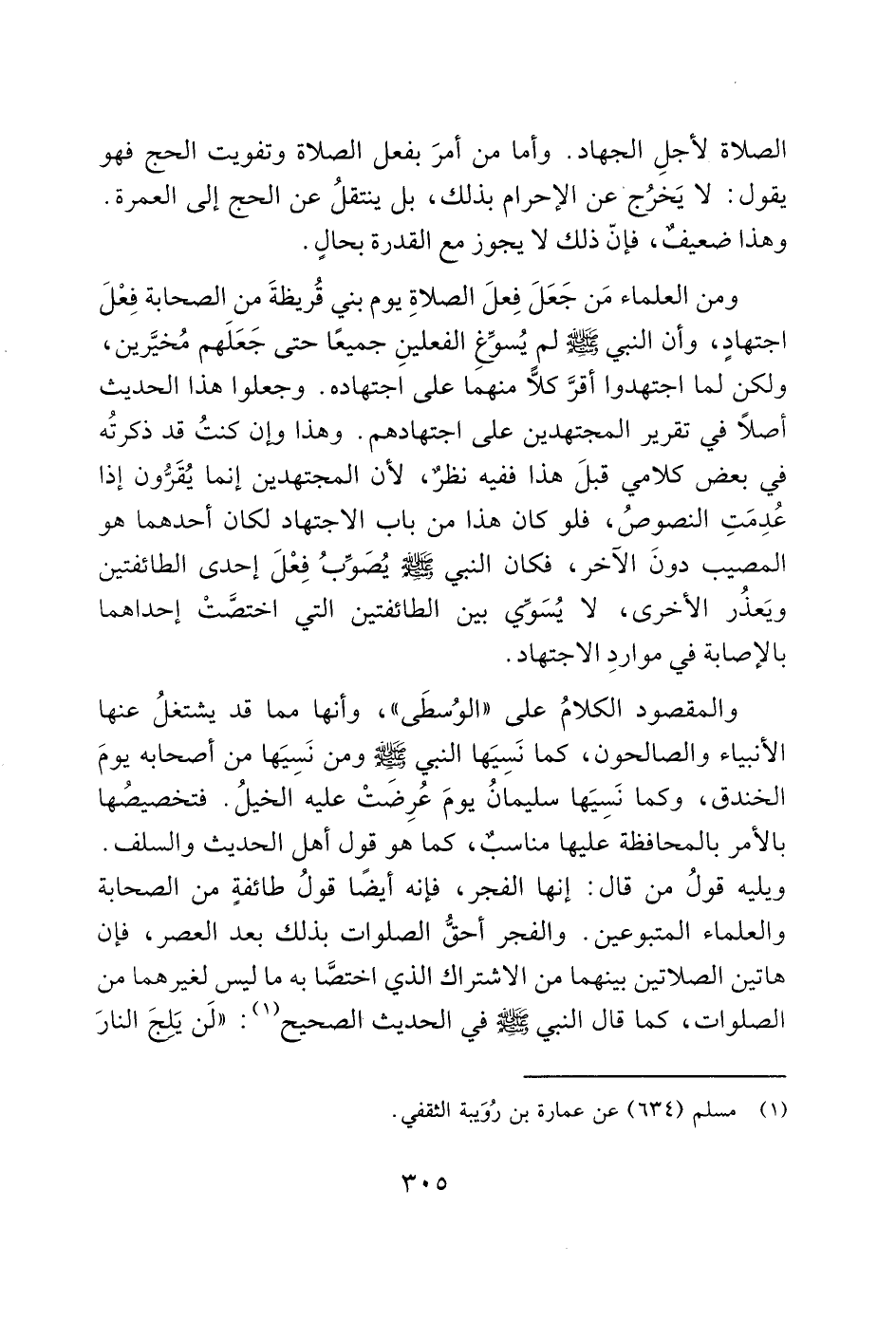 ومن العلماء مَن جَعَلَ فِعلَ الصلاةِ يوم بني قُريظةَ من الصحابة فِعْلَ اجتهادٍ، وأن النبي - صَلَّى اللَّهُ عَلَيْهِ وَسَلَّمَ - لم يُسوِّغ الفعلينِ جميعًا حتى جَعَلَهم مُخيَّرين، ولكن لما اجتهدوا أقرَّ كلاًّ منهما على اجتهاده. وجعلوا هذا الحديث أصلاً في تقرير المجتهدين على اجتهادهم. وهذا وإن كنتُ قد ذكرتُه في بعض كلامي قبلَ هذا ففيه نظرٌ، لأن المجتهدين إنما يُقَرُّون إذا عُدِمَتِ النصوصُ، فلو كان هذا من باب الاجتهاد لكان أحدهما هو المصيب دونَ الآخر، فكان النبي - صَلَّى اللَّهُ عَلَيْهِ وَسَلَّمَ - يُصَوِّبُ فِعْلَ إحدى الطائفتين ويَعذُر الأخرى، لا يُسَويّ بين الطائفتين التي اختصَّتْ إحداهما بالإصابة في مواردِ الاجتهاد.