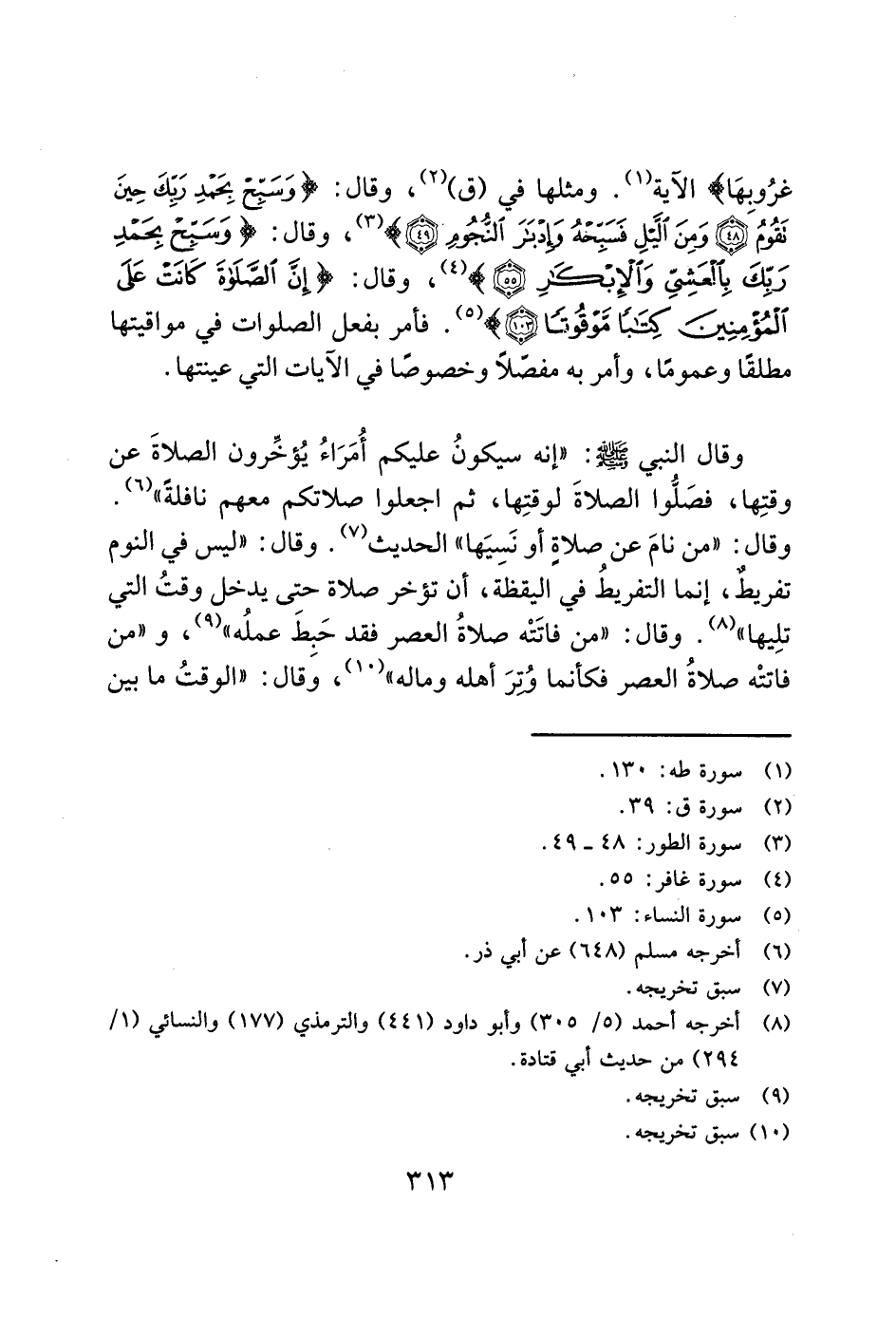 غُرُوبِهَا) الآية (1). ومثلها في (ق) (2)، وقال: (وَسَبِّحْ بِحَمْدِ رَبِّكَ حِينَ تَقُومُ (48) وَمِنَ اللَّيْلِ فَسَبِّحْهُ وَإِدْبَارَ النُّجُومِ (49)) (3)، وقال: (وَسَبِّحْ بِحَمْدِ رَبِّكَ بِالْعَشِيِّ وَالْإِبْكَارِ (55)) (4)، وقال: (إِنَّ الصَّلَاةَ كَانَتْ عَلَى الْمُؤْمِنِينَ كِتَابًا مَوْقُوتًا (103)) (5). فأمر بفعل الصلوات في مواقيتها مطلقًا وعمومًا، وأمر به مفصلاً وخصوصًا في الآيات التي عينتها.