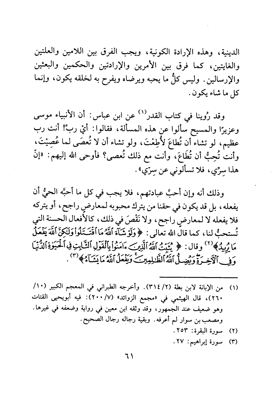 الدينية، وهذه الإرادة الكونية، ويجب الفرق بين اللامين والعلتين والغايتين، كما فرق بين الأمرين والإرادتين والحكمين والبعثين والإرسالين. وليس كلُّ ما يحبه ويرضاه ويفرح به لخلقه يكون، وإنما كل ماشاء يكون.