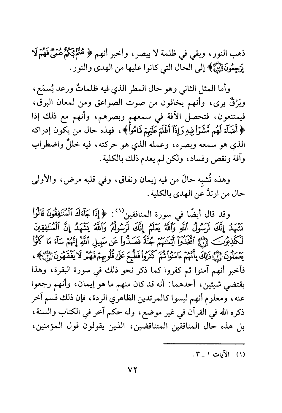 وقد قال أيضًا في سورة المنافقين (1): (إِذَا جَاءَكَ الْمُنَافِقُونَ قَالُوا نَشْهَدُ إِنَّكَ لَرَسُولُ اللَّهِ وَاللَّهُ يَعْلَمُ إِنَّكَ لَرَسُولُهُ وَاللَّهُ يَشْهَدُ إِنَّ الْمُنَافِقِينَ لَكَاذِبُونَ (1) اتَّخَذُوا أَيْمَانَهُمْ جُنَّةً فَصَدُّوا عَنْ سَبِيلِ اللَّهِ إِنَّهُمْ سَاءَ مَا كَانُوا يَعْمَلُونَ (2) ذَلِكَ بِأَنَّهُمْ آَمَنُوا ثُمَّ كَفَرُوا فَطُبِعَ عَلَى قُلُوبِهِمْ فَهُمْ لَا يَفْقَهُونَ (3)) فأخبر أنهم آمنوا ثم كفروا كما ذكر نحو ذلك في سورة البقرة، وهذا يقتضي شيئين، أحدهما: أنه قد كان منهم ما هو إيمان، وأنهم رجعوا عنه، ومعلوم أنهم ليسوا كالمرتدين الظاهري الردة، فإن ذلك قسم آخر ذكره الله في القرآن في غير موضع، وله حكم آخر في الكتاب والسنة، بل هذه حال المنافقين المتناقضين، الذين يقولون قول المؤمنين،