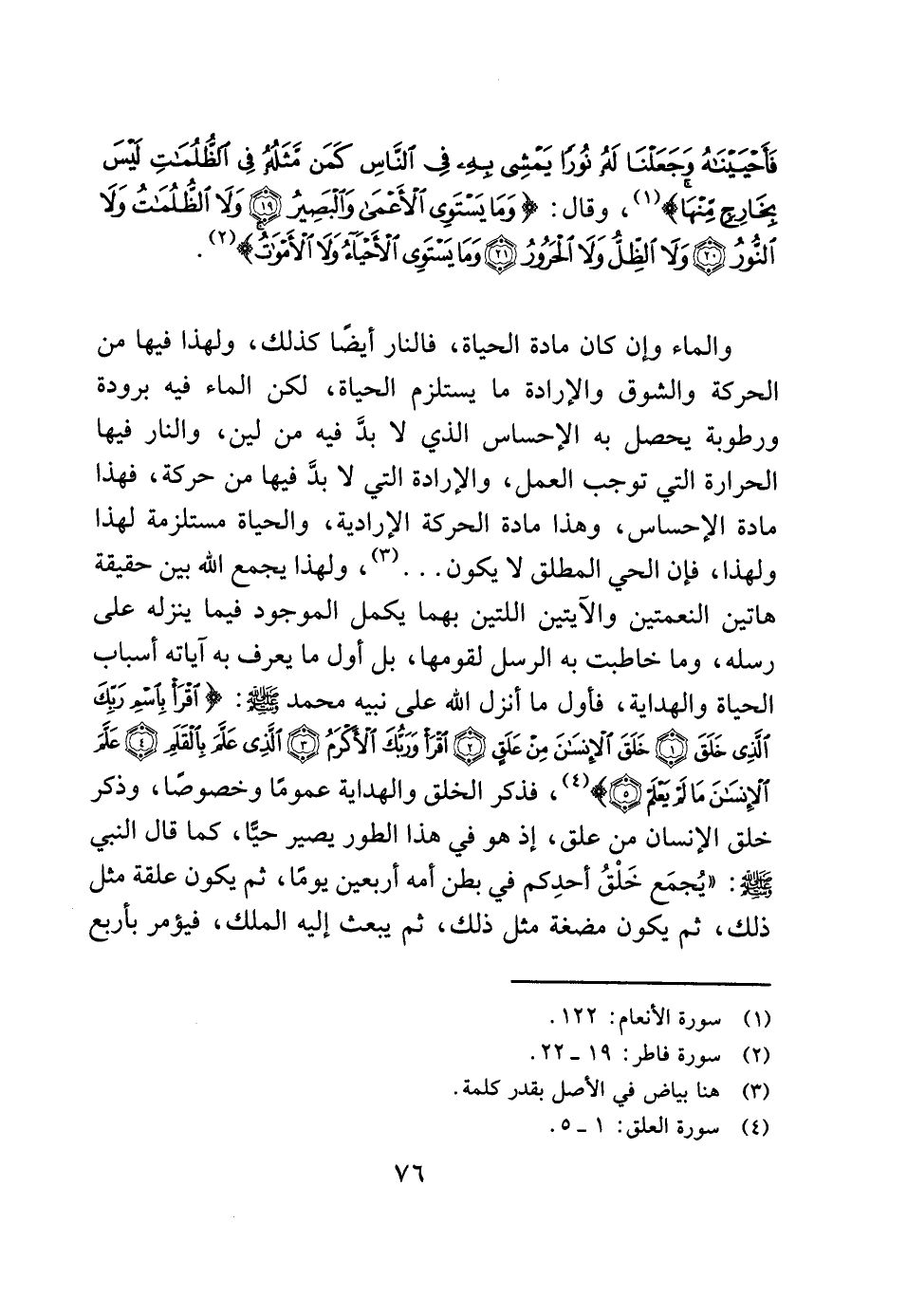 والماء وإن كان مادة الحياة، فالنار أيضا كذلك، ولهذا فيها من الحركة والشوق والإرادة ما يستلزم الحياة، لكن الماء فيه برودة ورطوبة يحصل به الإحساس الذي لا بدَّ فيه من لين، والنار فيها الحرارة التي توجب العمل، والإرادة التي لا بدَّ فيها من حركة، فهذا مادة الإحساس، وهذا مادة الحركة الإرادية، والحياة مستلزمة لهذا ولهذا، فإن الحي المطلق لا يكون ... (3)، ولهذا يجمع الله بين حقيقة هاتين النعمتين والاَيتين اللتين بهما يكمل الموجود فيما ينزله على رسله، وما خاطبت به الرسل لقومها، بل أول ما يعرف به آياته أسباب الحياة والهداية، فأول ما أنزل الله على نبيه محمد - صَلَّى اللَّهُ عَلَيْهِ وَسَلَّمَ -: (اقْرَأْ بِاسْمِ رَبِّكَ الَّذِي خَلَقَ (1) خَلَقَ الْإِنْسَانَ مِنْ عَلَقٍ (2) اقْرَأْ وَرَبُّكَ الْأَكْرَمُ (3) الَّذِي عَلَّمَ بِالْقَلَمِ (4) عَلَّمَ الْإِنْسَانَ مَا لَمْ يَعْلَمْ (5)) (4)، فذكر الخلق والهداية عموماً وخصوصاً، وذكر خلق الإنسان من علق، إذ هو في هذا الطور يصير حيّا، كما قال النبي - صَلَّى اللَّهُ عَلَيْهِ وَسَلَّمَ -: " يُجمَع خَلْقُ أحدِكم في بطن أمه أربعين يوما، ثم يكون علقة مثل ذلك، ثم يكون مضغة مثل ذلك، ثم يبعث إليه الملك، فيؤمر بأربع