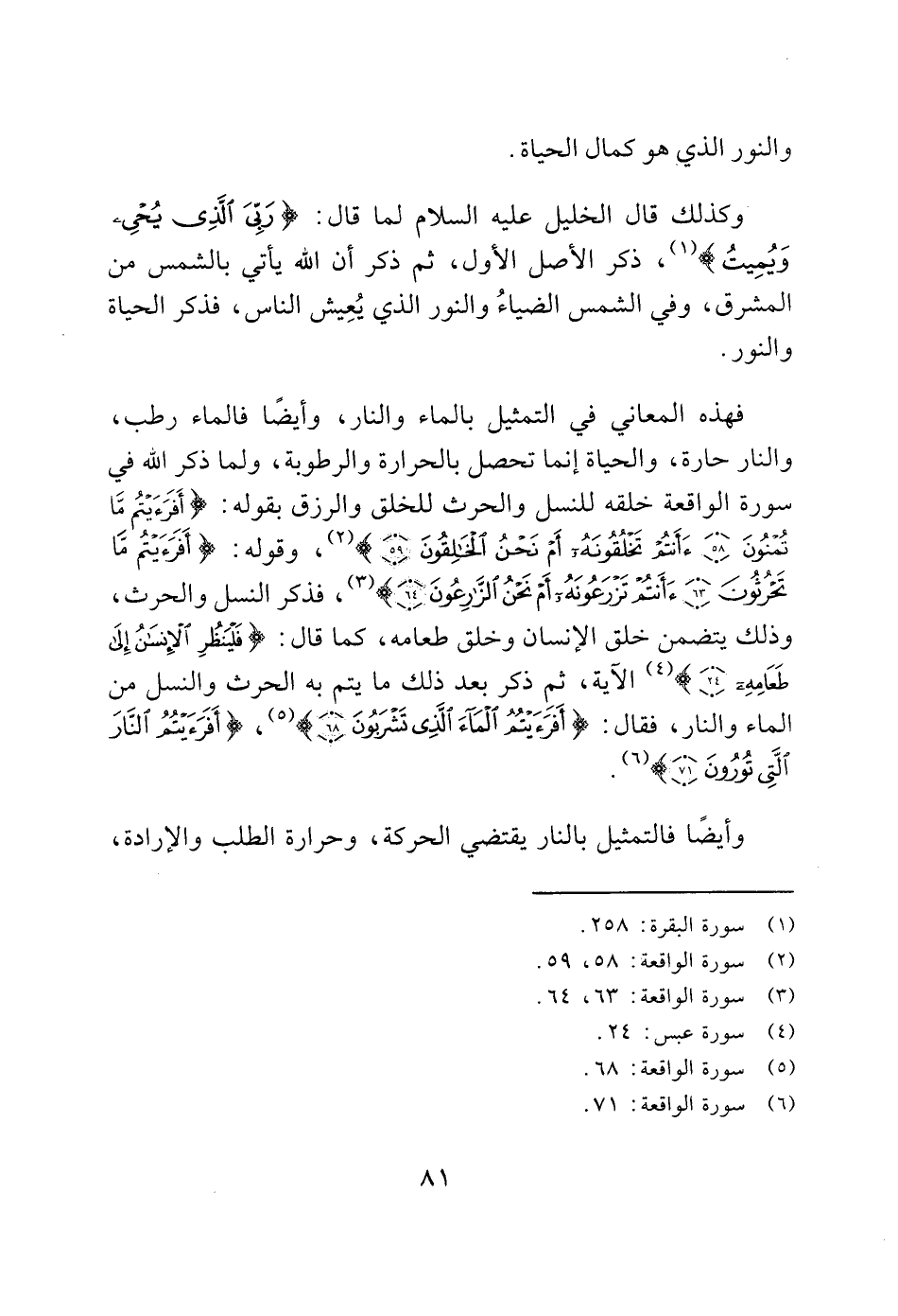 فهذه المعاني في التمثيل بالماء والنار، وأيضا فالماء رطب، والنار حارة، والحياة إنما تحصل بالحرارة والرطوبة، ولما ذكر الله في سورة الواقعة خلقه للنسل والحرث للخلق والرزق بقوله: (أَفَرَأَيْتُمْ مَا تُمْنُونَ (58) أَأَنْتُمْ تَخْلُقُونَهُ أَمْ نَحْنُ الْخَالِقُونَ (59)) (2)، وقوله: (أَفَرَأَيْتُمْ مَا تَحْرُثُونَ (63) أَأَنْتُمْ تَزْرَعُونَهُ أَمْ نَحْنُ الزَّارِعُونَ (64)) (3)، فذكر النسل والحرث، وذلك يتضمن خلق الإنسان وخلق طعامه، كما قال: (فَلْيَنْظُرِ الْإِنْسَانُ إِلَى طَعَامِهِ (24)) (4) الآية، ثم ذكر بعد ذلك ما يتم به الحرث والنسل من الماء والنار، فقال: (أَفَرَأَيْتُمُ الْمَاءَ الَّذِي تَشْرَبُونَ (68)) (5)، (أَفَرَأَيْتُمُ النَّارَ الَّتِي تُورُونَ (71)) (6).