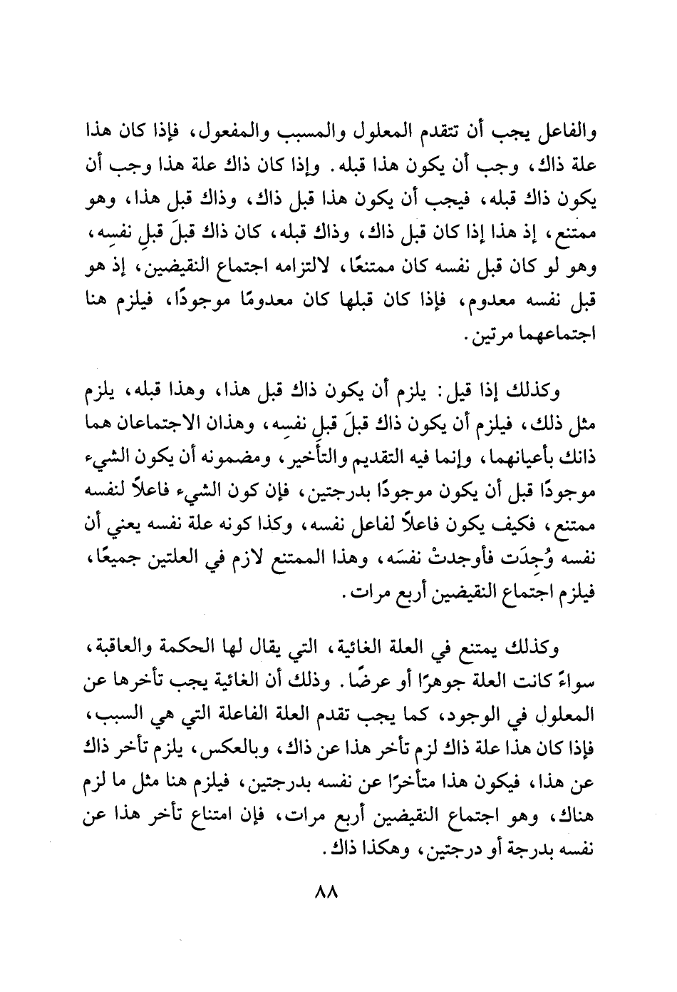 وكذلك إذا قيل: يلزم أن يكون ذاك قبل هذا، وهذا قبله، يلزم مثل ذلك، فيلزم أن يكون ذاك قبلَ قبلِ نفسِه، وهذان الاجتماعان هما ذانك باعيانهما، وإنما فيه التقديم والتأخير، ومضمونه أن يكون الشيء موجودًا قبل أن يكون موجودًا بدرجتين، فإن كون الشيء فاعلاً لنفسه ممتنع، فكيف يكون فاعلاً لفاعل نفسه، وكذا كونه علة نفسه يعني أن نفسه وُجدَت فأوجدتْ نفسَه، وهذا الممتنع لازم في العلتين جميعًا، فيلزم اجَتماع النقيضين أربع مرات.