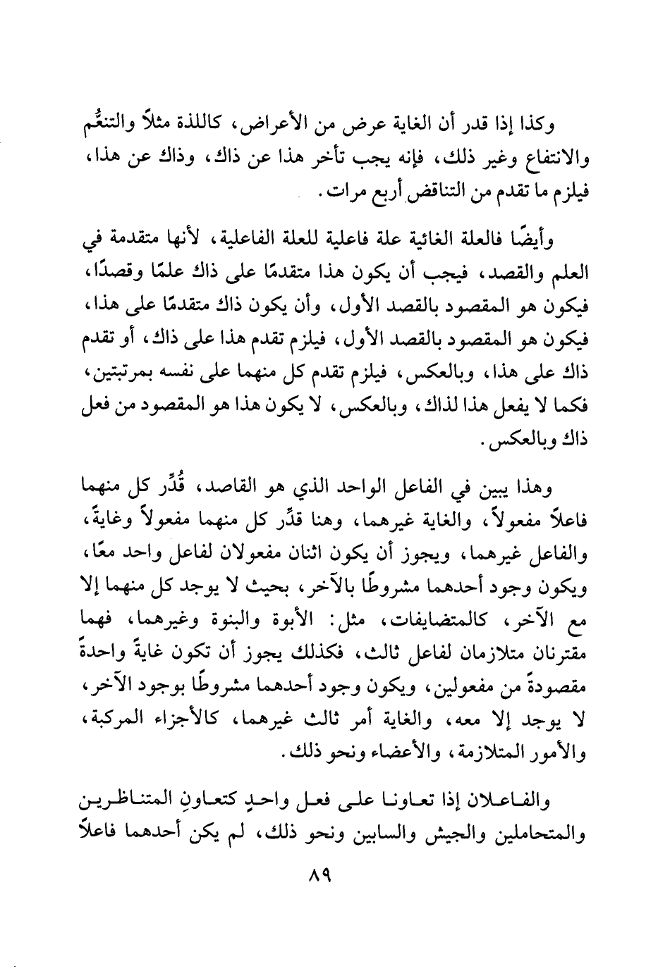 وهذا يبين في الفاعل الواحد الذي هو القاصد، قُدِّر كل منهما فاعلاً مفعولاً، والغاية غيرهما، وهنا قدِّر كل منهما مفعولاً وغايةً، والفاعل غيرهما، ويجوز أن يكون اثنان مفعولان لفاعل واحد معًا، ويكون وجود أحدهما مشروطًا بالاَخر، بحيث لا يوجد كل منهما إلا مع الآخر، كالمتضايفات، مثل: الأبوة والبنوة وغيرهما، فهما مقترنان متلازمان لفاعل ثالث، فكذلك يجوز أن تكون غايةً واحدةً مقصودةً من مفعولين، ويكون وجود أحدهما مشروطًا بوجود الآخر، لا يوجد إلا معه، والغاية أمر ثالث غيرهما، كالأجزاء المركبة، والأمور المتلازمة، والأعضاء ونحو ذلك.