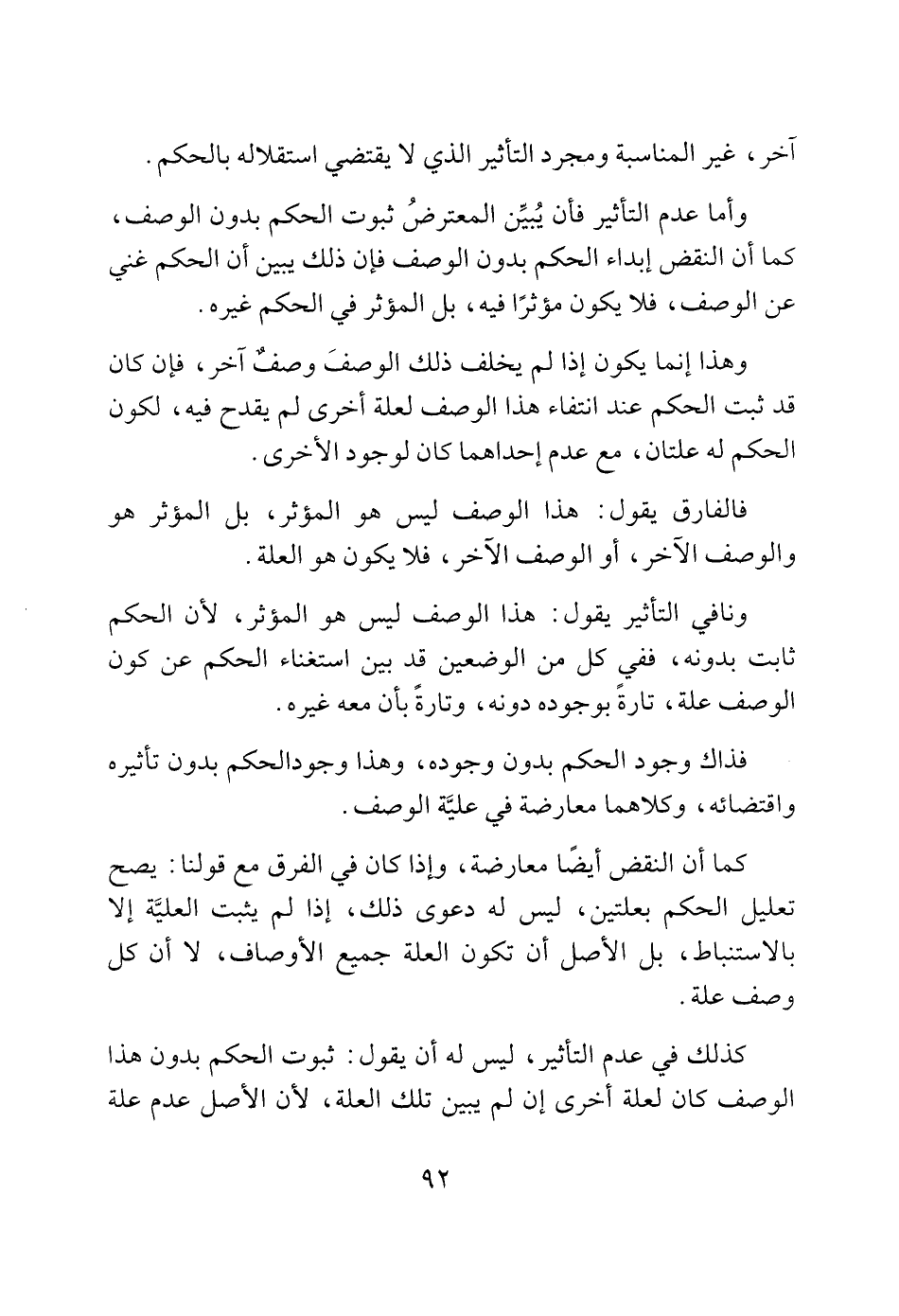 وأما عدم التأثير فأن يُبيِّن المعترضُ ثبوت الحكم بدون الوصف، كما أن النقض إبداء الحكم بدون الوصف فإن ذلك يبين أن الحكم غني عن الوصف، فلا يكون مؤثرًا فيه، بل المؤثر في الحكم غيره.