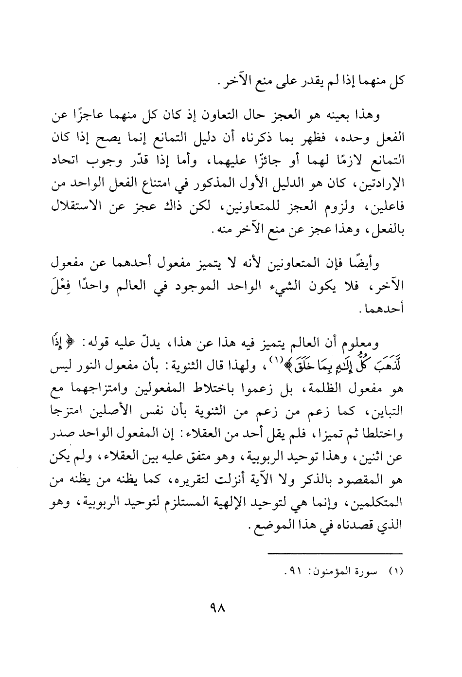 وهذا بعينه هو العجز حال التعاون إذ كان كل منهما عاجزًا عن الفعل وحده، فظهر بما ذكرناه أن دليل التمانع إنما يصح إذا كان التمانع لازمًا لهما أو جائزًا عليهما، وأما إذا قدّر وجوب اتحاد الإرادتين، كان هو الدليل الأول المذكور في امتناع الفعل الواحد من فاعلين، ولزوم العجز للمتعاونين، لكن ذاك عجز عن الاستقلال بالفعل، وهذا عجز عن منع الآخر منه.