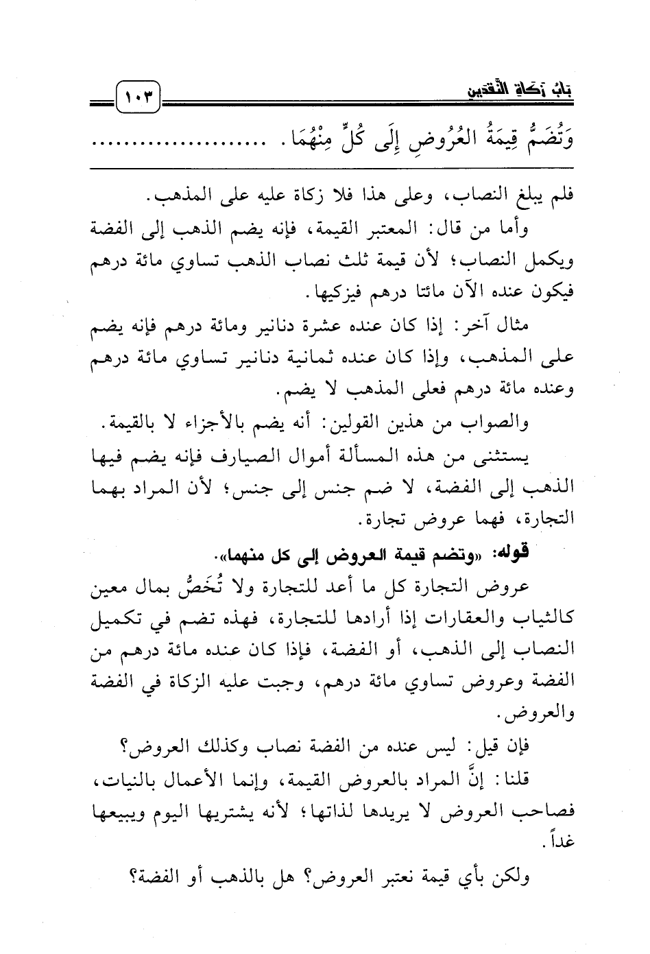 مثال آخر: إذا كان عنده عشرة دنانير ومائة درهم فإنه يضم على المذهب، وإذا كان عنده ثمانية دنانير تساوي مائة درهم وعنده مائة درهم فعلى المذهب لا يضم.